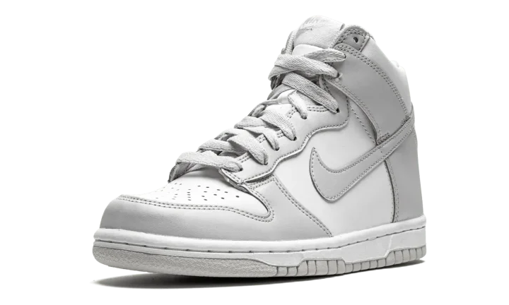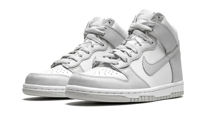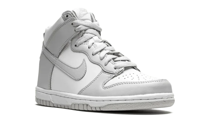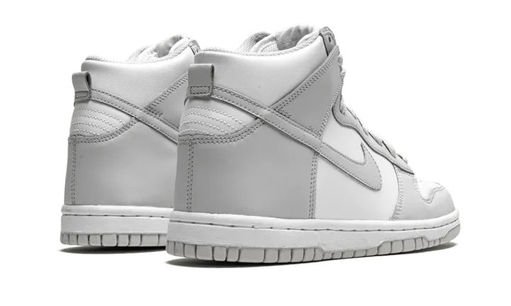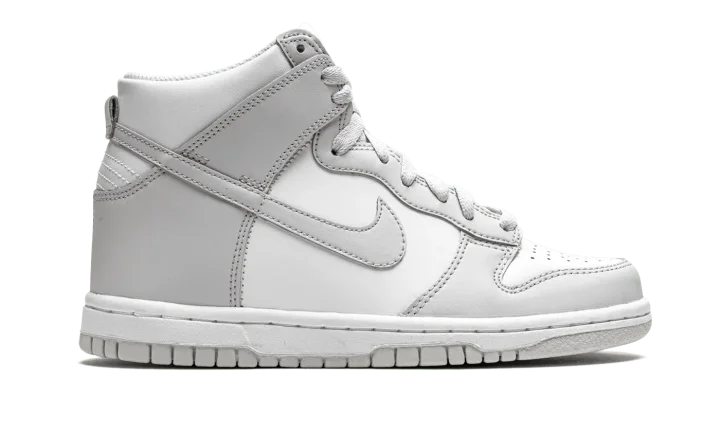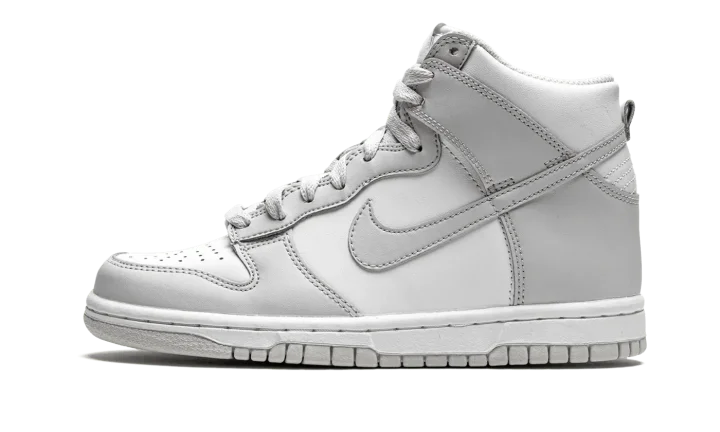 The Nike Dunk High GS "Vast Grey" is the youth sizing of the understated colorway for the venerable high-top shoe. This February 2021 colorway dubbed "Vast Grey" keeps a simple and versatile two-tone white and grey color block, a design ethos shared by some of the greatest Dunk styles of all-time. White leather forms the base of the upper, appearing on the perforated toe and the mid-panel, collar, and heel. Vast Grey leather overlays, which includes a Swoosh logo on either side of the shoe, form a low-contrast to the white leather detailing. A grey nylon branding tag is stitched onto the top of the white mesh tongue. Underfoot, the "Vast Grey" features a white midsole and grey outsole. Release date: February 25, 2021