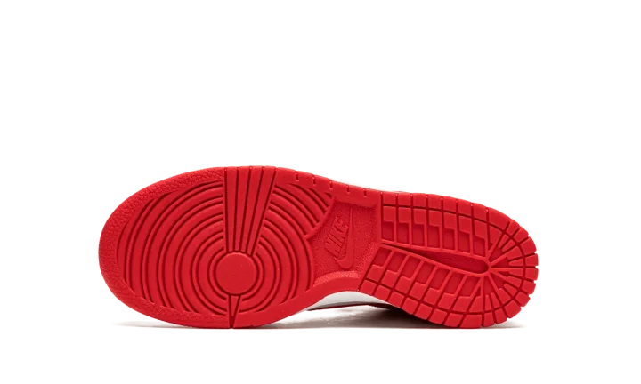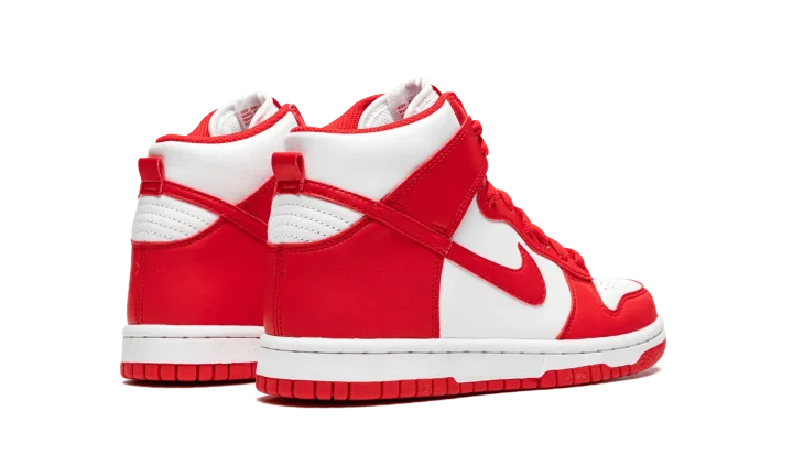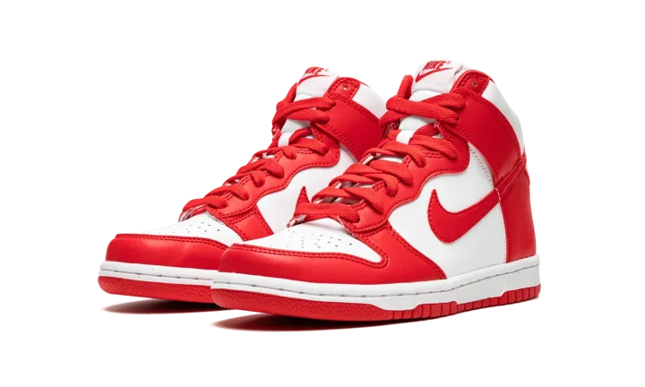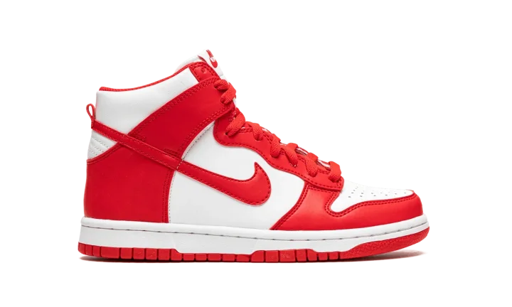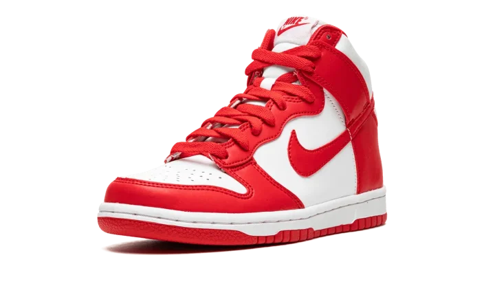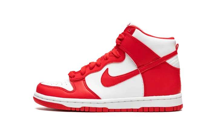 The Nike Dunk High GS "Championship Red" is the youth sizing of the classic two-tone colorway of the retro basketball shoe. The "Championship Red" Dunk High is designed in a similar two-tone color scheme to the original "Be True to Your School" Dunks from 1985. More specifically, it features a white leather base with University Red leather overlays and a red leather Swoosh on the sides. "Nike" and Swoosh branding are found on the tongue tag. A white rubber midsole and red rubber outsole complete the look.