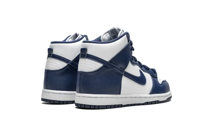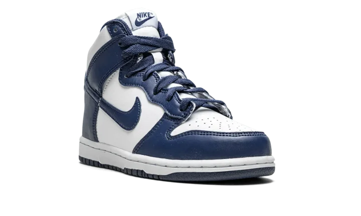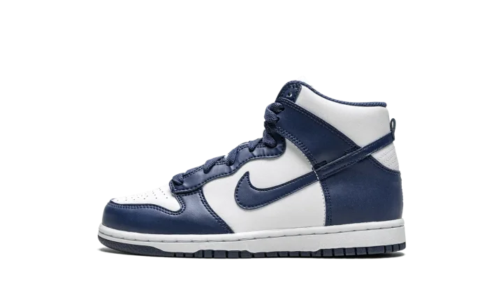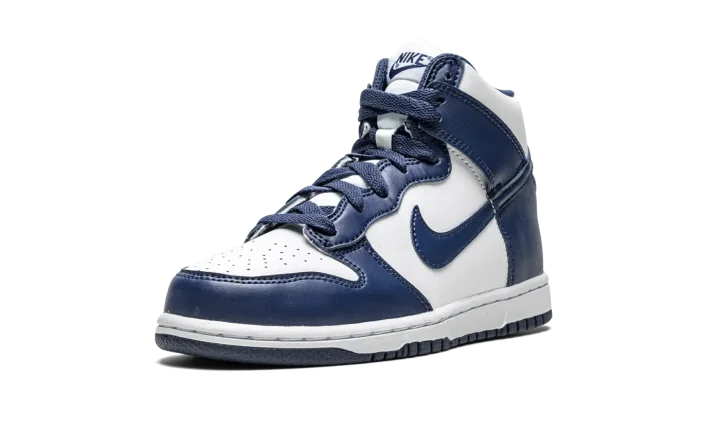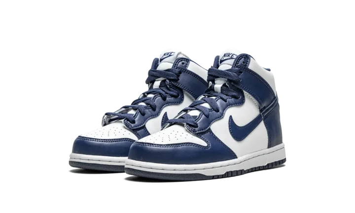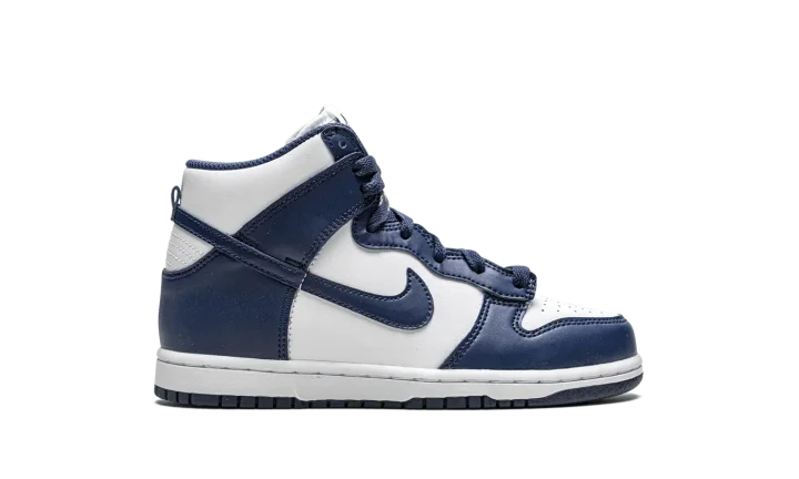 The Nike Dunk High PS "Championship Blue" is the preschool version of the original colorway of the Dunk that was created for the Villanova Wildcats college basketball team in 1985. The "Championship Blue" or "Villanova" colorway was an original member of the "Be True to Your School" pack of Dunks created for top college basketball teams in the country in the mid-80s. The perforated toe, mid-panel, and collar are constructed in white leather. The overlays and Swoosh appear in Championship Navy. A navy "Nike" logo appears on the tongue tag and navy laces are layered over the white nylon tongue. Release date: October 8, 2021