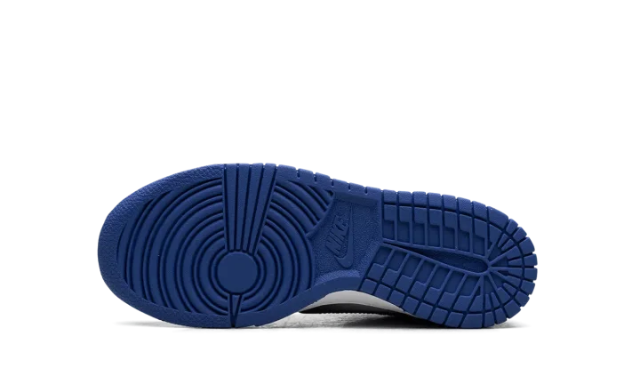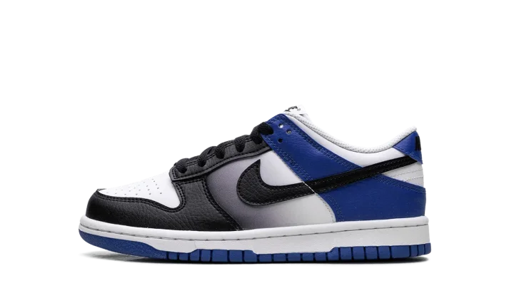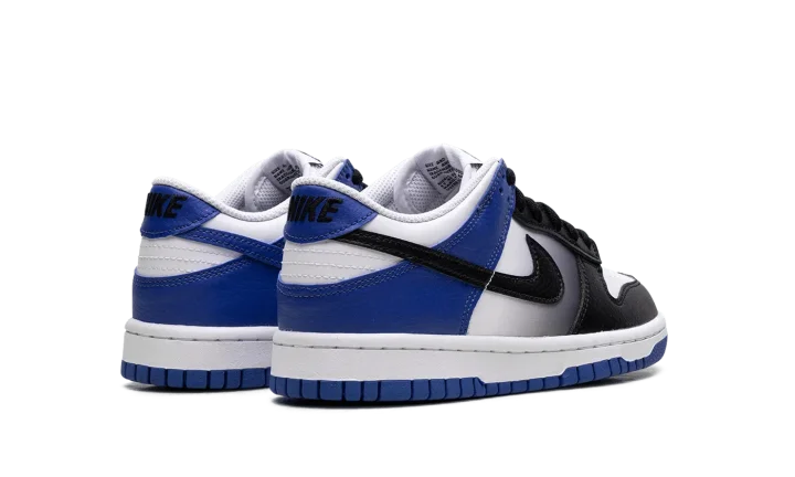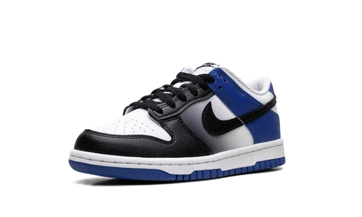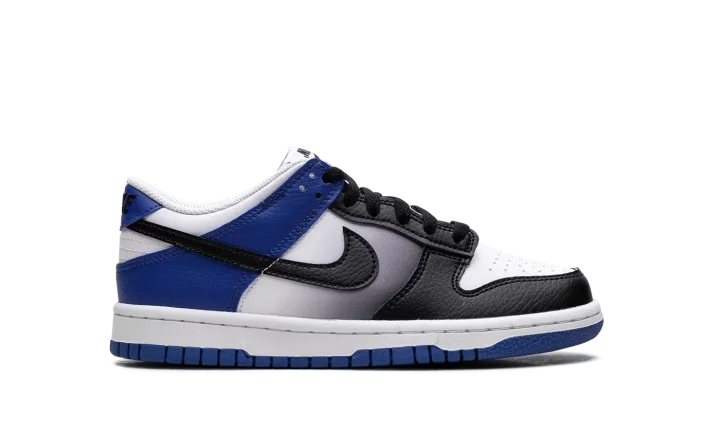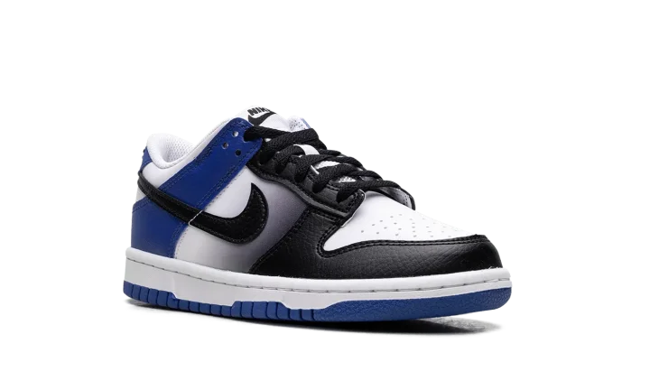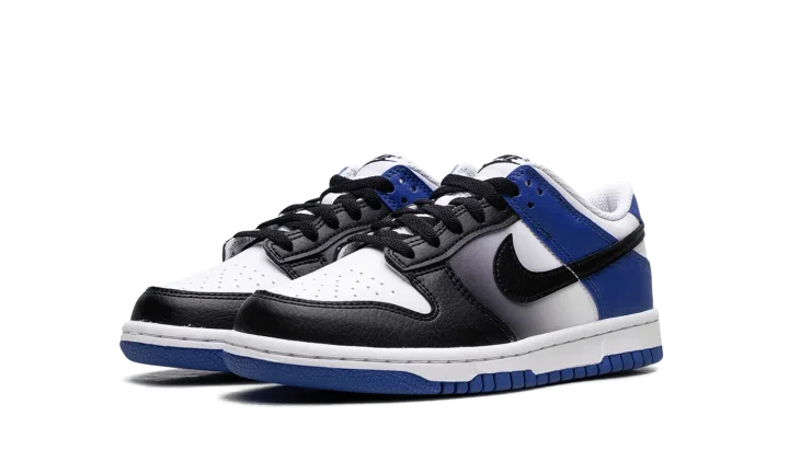 The Nike Dunk Low GS 'Game Royal Black Fade' rocks a white leather upper, contrasted by black accents on the forefoot and blue on the heel.