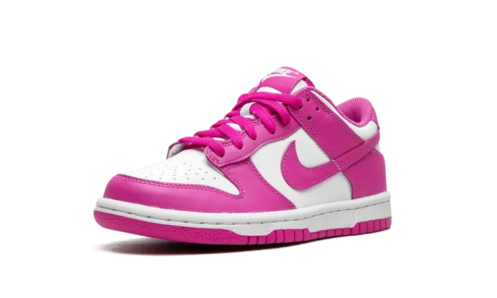 The Nike Dunk Low GS "Active Fuchsia" is the youth sizing of the classic basketball shoe in a colorway that undoubtedly turns heads with its pink accenting. The "Active Fuchsia" gives the Dunk Low a can't-miss vibe with the bright pink hue on the leather overlays against a white leather base. The same neon pink is also found on the leather Swoosh on the sides, on the tongue tag with "Nike" branding, and on the laces. It also appears on the rubber outsole that is paired with the white midsole. Release date: March 1, 2023
