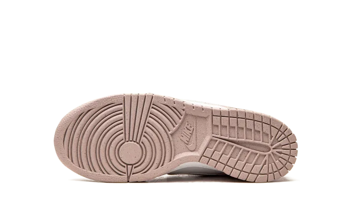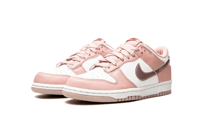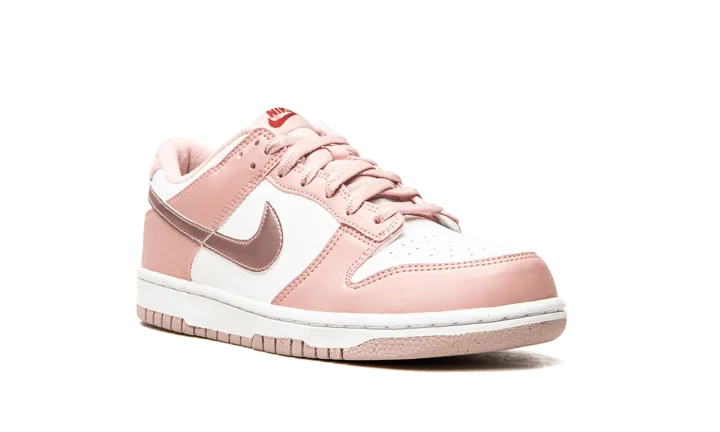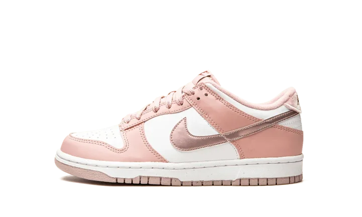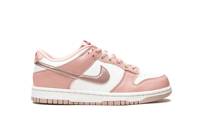 The Nike Dunk Low GS "Pink Velvet" is a youth version of the vintage basketball shoe in a Valentine's Day-esque colorway. The two-tone, white-and-pink design was released by Nike in November 2021. A white leather base is paired with Pink Glaze leather overlays and metallic Swoosh branding. A red "Nike" logo is embroidered onto the velvet heel tab and red "Nike" and Swoosh detailing is printed on the pink nylon tongue tag. A plush pink terry cloth inner lining provides a comfortable feel. Finishing touches include a white rubber midsole and a lightly speckled pink outsole, which is composed of 15% recycled Nike "Grind" rubber. Release date: November 24, 2021