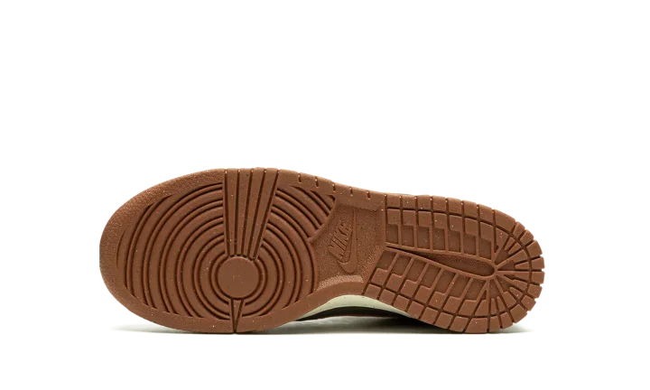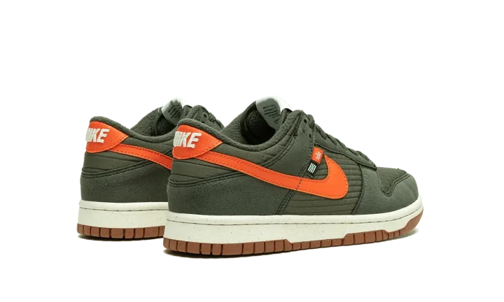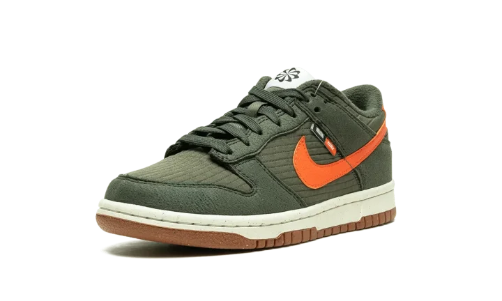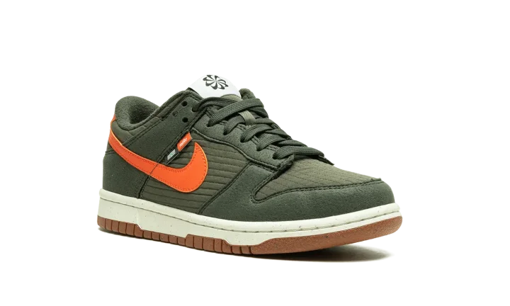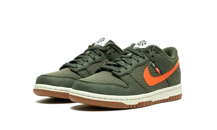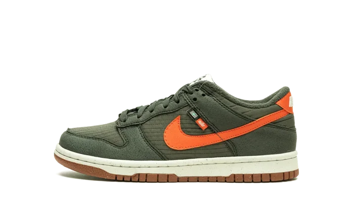 The Nike Dunk Low Toasty "Sequoia" is a grade-school version of the vintage basketball sneaker with a winter-ready design. From Nike's "Toasty" collection, the Dunk Low Toasty is ideal for walking, playing, or running in cold weather as it features a warm, fuzzy fleece interior lining. The shoe's upper consists of an olive green, quilted textile material on the toe and mid-panel, along with tonal suede overlays. The Swoosh on each side is orange, while the orange leather heel tab features white "Nike" branding. The pinwheel graphic printed on the brown tongue tag references the shoe's sustainable design, meaning it's made from 20% recycled content by weight.