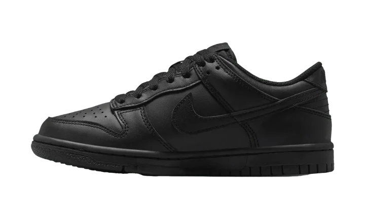 The 2025 edition of the Nike Dunk Low GS 'Triple Black' delivers a tonal black finish on the leather upper, featuring heritage details that include a perforated toe box and a breathable nylon tongue.