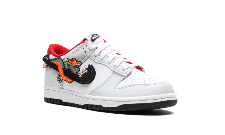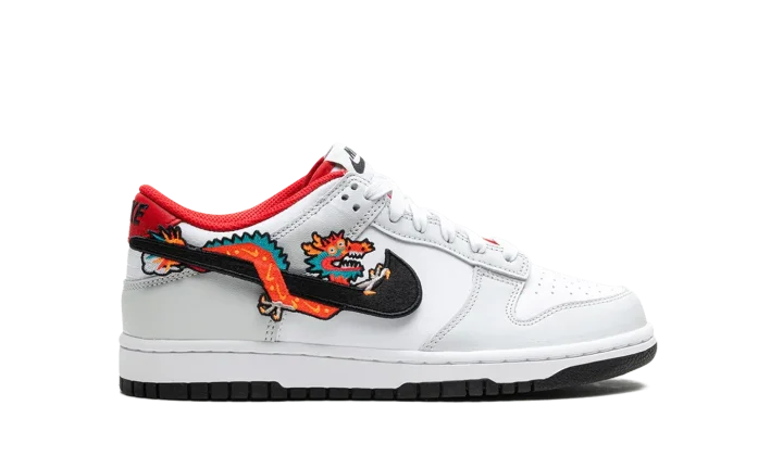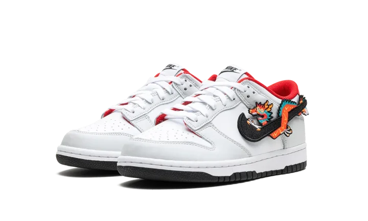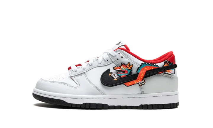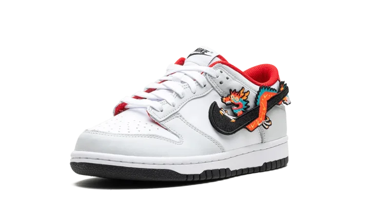 The Nike Dunk Low GS "Year of the Dragon" is the youth sizing of the retro basketball shoe in a colorway that honors the 2024 Lunar New Year. The Dunk Low GS "Year of the Dragon" celebrates the traditional Chinese holiday, specifically the Chinese zodiac sign of the dragon. The upper has a white leather base with grey leather overlays. On the lateral side, a removable velcro Swoosh features a dragon graphic around the logo. Fiery University Red accenting, as a nod to the lucky color in Chinese culture, appears on the lining and leather heel tab with "Nike" branding. Underfoot, a white midsole and black outsole complete the look. Release date: January 2, 2024