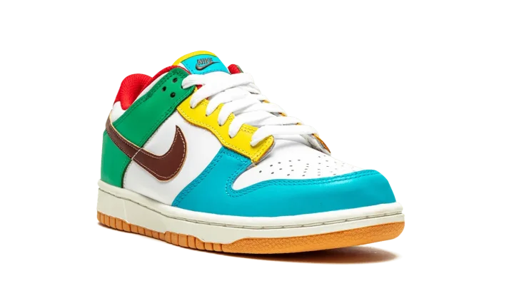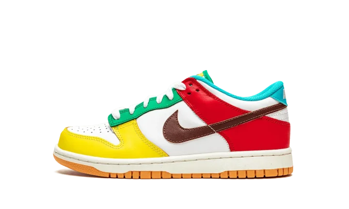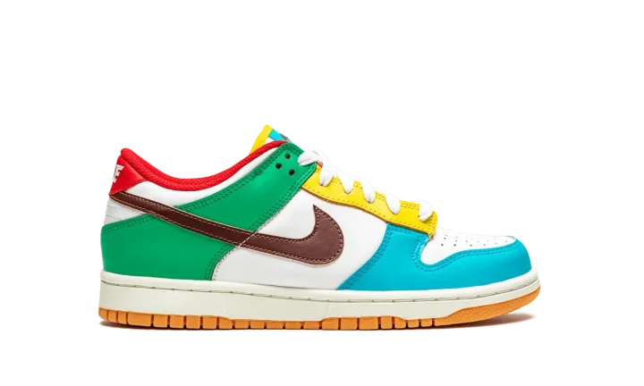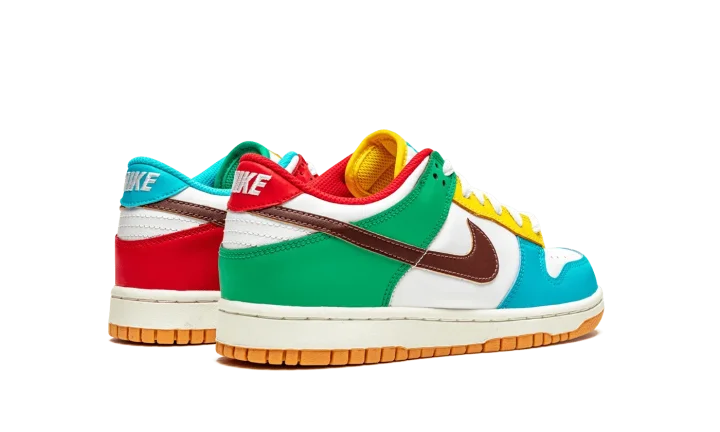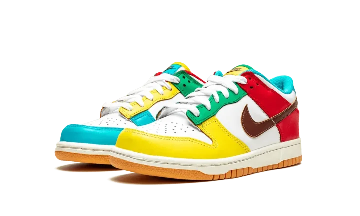 The Nike Dunk Low SE GS "Free 99 - White" is the youth sizing of the white-based colorway of the low-top lifestyle shoe from Nike's "Free 99" capsule. The two-pack of Dunks was released by Nike in Summer 2021 and consists of two makeups of the legendary Dunk in white and black-based colorways with contrasting soft pastel leather panels in a mismatching color block. Specifically, blue, yellow, green, and red pastels highlight the overlays on the toe cap, forefoot, eyelets, collar, and heel on both the left and right shoe. A dark chocolate leather Swoosh breaks up the appearance and "Nike" is embroidered on the mismatched leather heel tabs. Elsewhere, "Nike" branding with a Swoosh can be found on the blue and yellow nylon tongue tags on the left and right shoe, respectively. Finishing touches include a white midsole and gum-colored rubber outsole. Release date: June 25, 2021