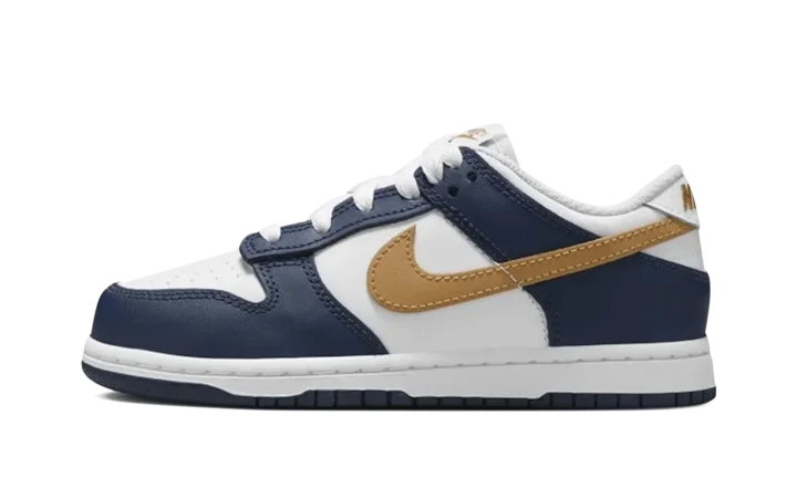 Made for little kids, the Nike Dunk Low PS 'Midnight Navy Wheat' combines a stark white leather foundation with navy overlays and a Wheat-colored Swoosh