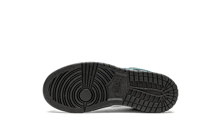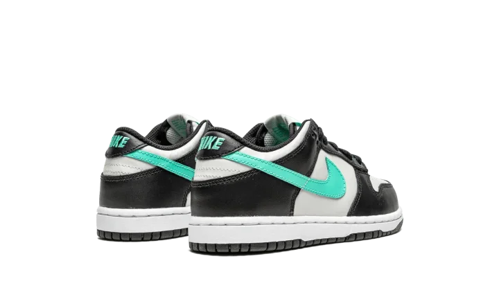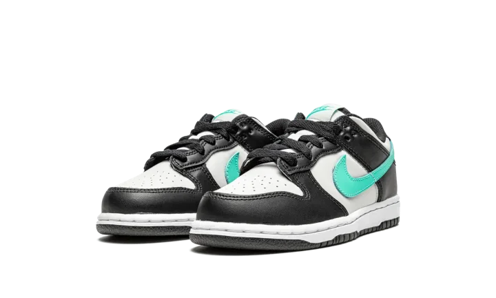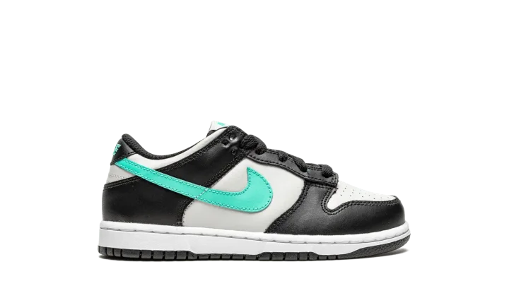The Nike Dunk Low PS "Tropical Twist" is the preschool sizing of the kids-exclusive colorway of the low-top, retro basketball and lifestyle that pays homage to one of the greatest Dunks of all time. With its teal, black, and white color block, the "Tropical Twist" undoubtedly references the color block of the Diamond Supply Co. x Nike SB Dunk Low "Tiffany," a highly desirable colorway imagined by the skate brand and Nike SB in 2005. Although not a direct one-to-one remake of the "Tiffany," the "Tropical Twist" channels the former's spirit with its turquoise leather Swoosh and black leather overlays. Light Bone leather appears on the perforated toe, mid-panel, and heel. Teal "Nike" detailing graces the heel and is printed on the white nylon tongue tag on top of the Light Bone-colored nylon tongue. Release date: June 10, 2021