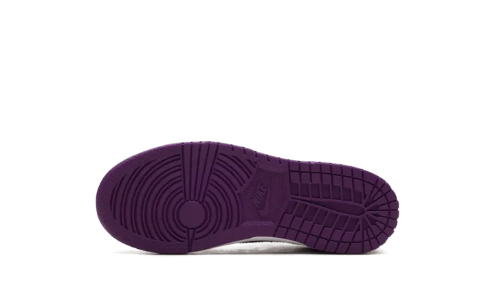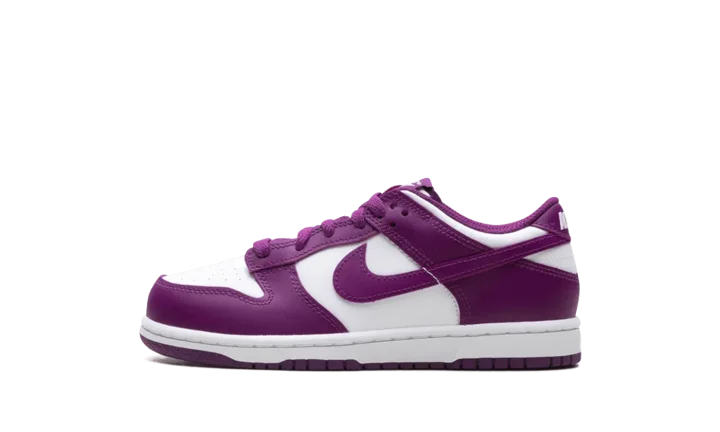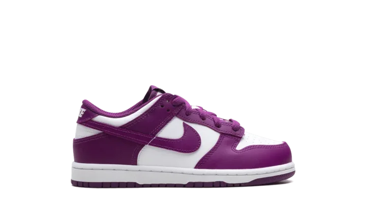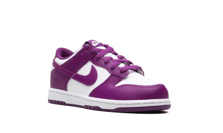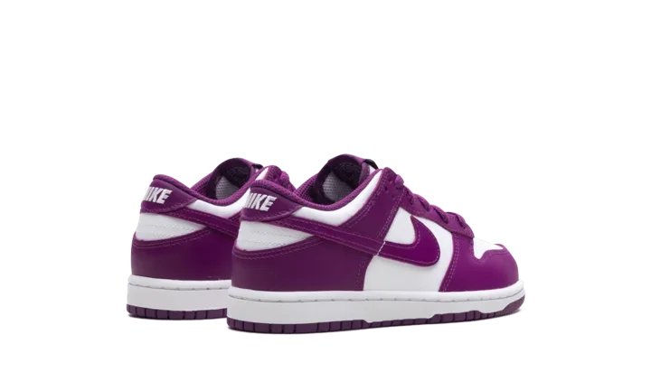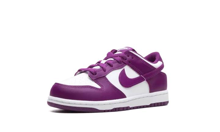 the Nike Dunk Low in the "White/Viotech-White" colorway, designed for Little Kids or Preschoolers (PS). This classic basketball-inspired sneaker features a premium leather upper, a soft foam midsole for cushioning, a padded collar for comfort, and a durable rubber outsole with pivot-point tread for excellent grip.