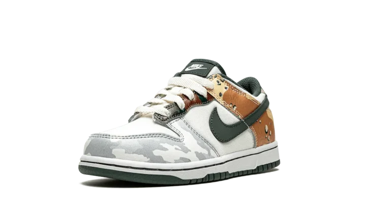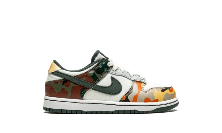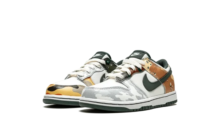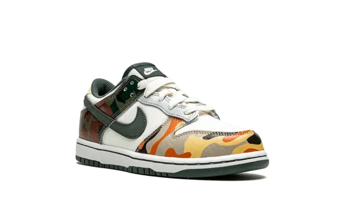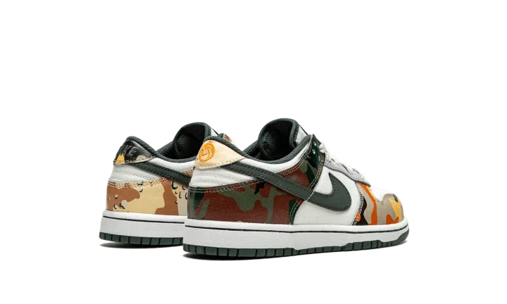 Multicolour leather Dunk Low SE "Multi-Camo" sneakers from NIKE KIDS featuring camouflage print, contrasting panel detail, round toe, front lace-up fastening, logo patch at the tongue, branded insole and rubber sole. These styles are supplied by a premium sneaker marketplace. Stocking only the most sought-after footwear, they source and curate some of the most hard to find sneakers from around the world..