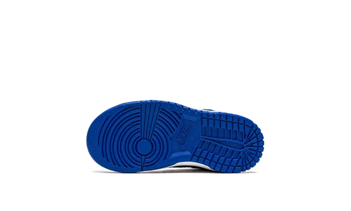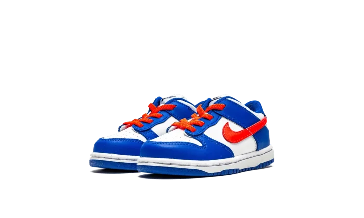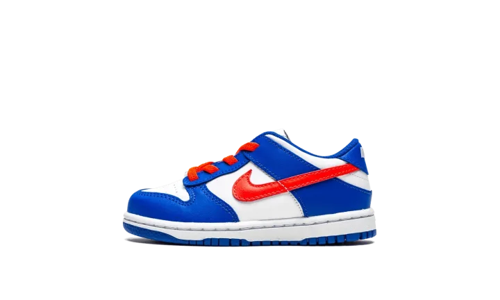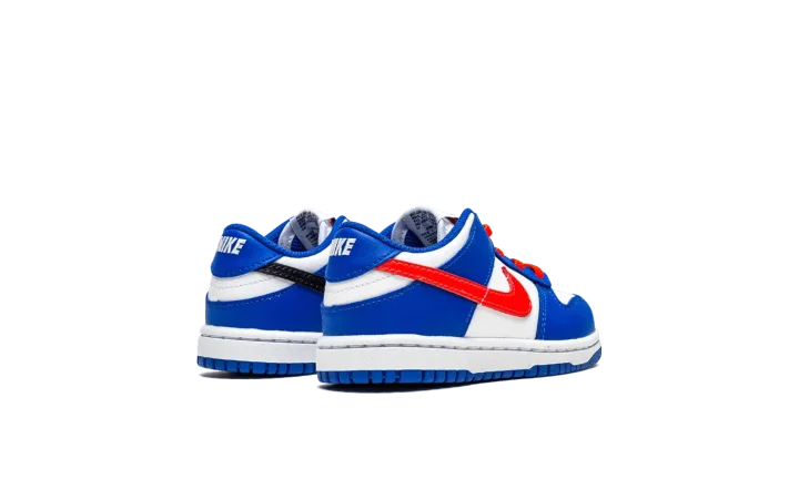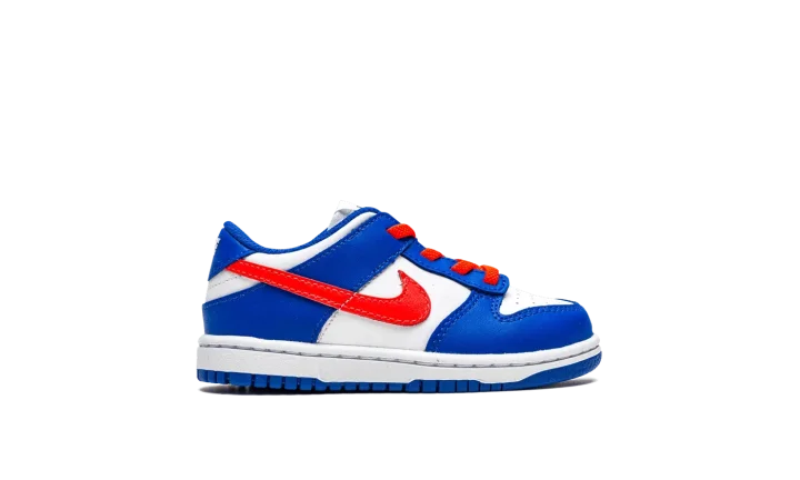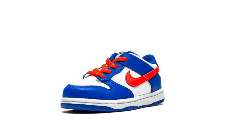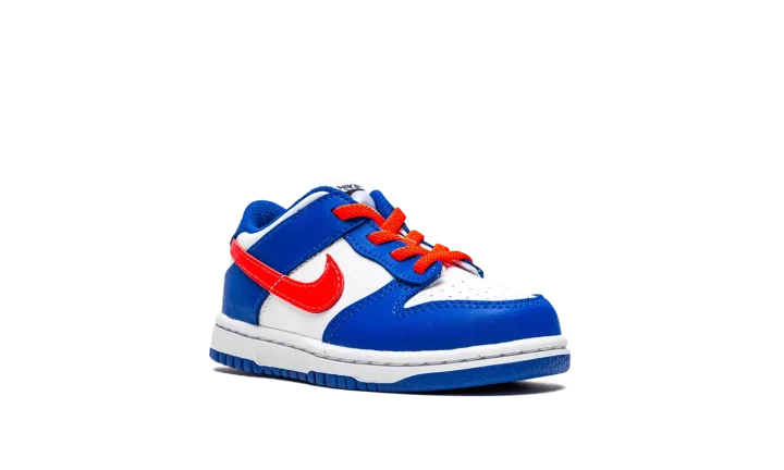 The Nike Dunk Low TD "Game Royal/Bright Crimson" is the toddler version of the classic basketball shoe in a patriotic red, white, and blue colorway. Nike continued the Dunk's comeback story in 2021 by releasing this easy-wearing look for the timeless low-top shoe. The "Game Royal/Bright Crimson" features white leather on the perforated toe, mid-panel, collar, and heel. Game Royal accenting appears on the overlay panels and a Bright Crimson leather Swoosh dots either side of the shoe. A white "Nike" logo is embroidered on the heel and black "Nike" with a Swoosh branding is printed on the tongue tag. Fiery red laces on the tongue complete the look.