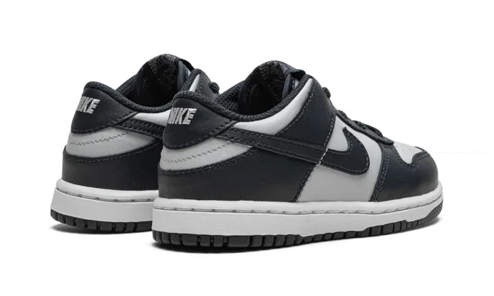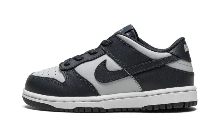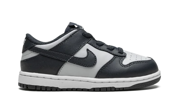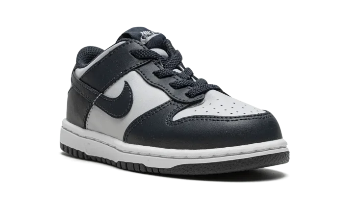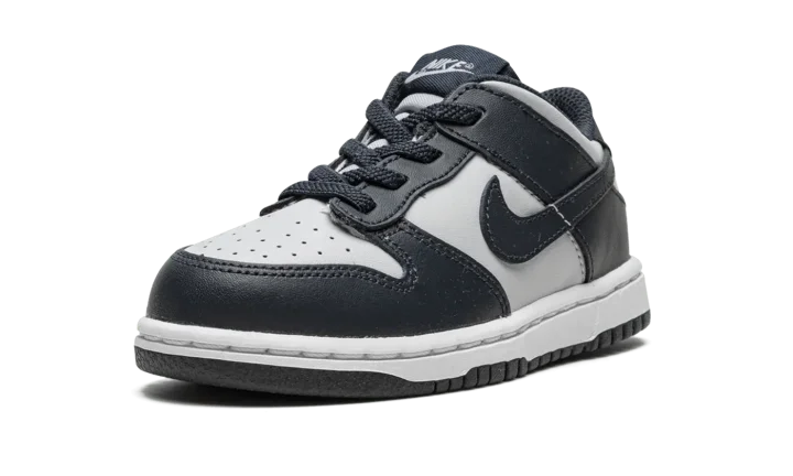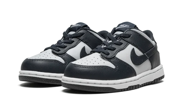 The Nike Dunk Low TD "Georgetown" is the toddler sizing of the two-tone, grey-and-navy colorway of the vintage basketball shoe once worn by the Georgetown Hoyas college basketball team in the 1980s. Released in full family sizing in 2021, the design features Wolf Grey leather on the perforated toe, mid-panel, collar, and heel. Contrasting Dark Obsidian leather appears on the overlays and on the Swoosh. Throwback "Nike" detailing is embroidered on the heel and nylon tongue tag. The laces are finished off in Dark Obsidian. Underfoot, a white midsole and dark navy blue outsole round out the look. Release date: November 5, 2021
