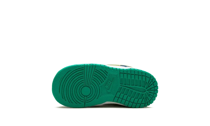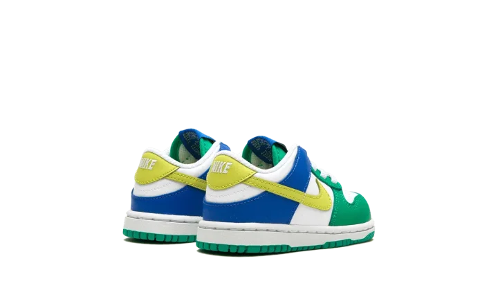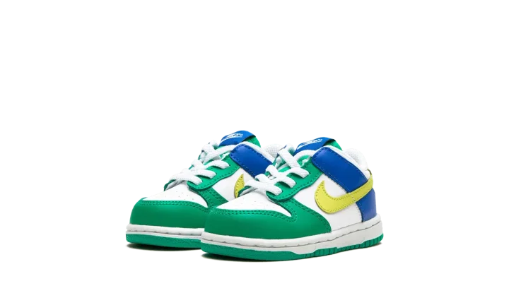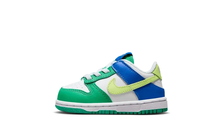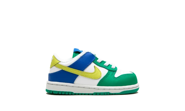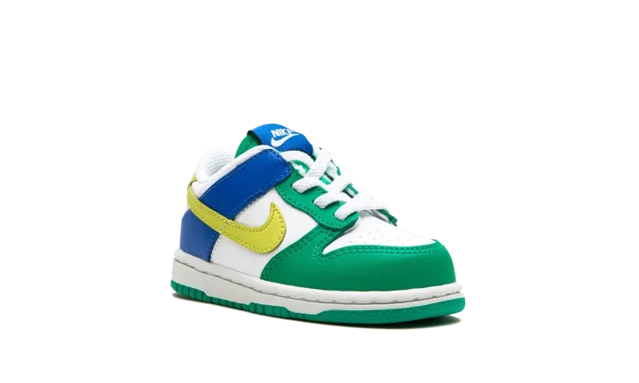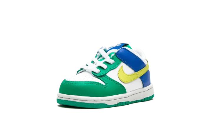 The Nike Dunk Low TD "Green/Blue" is the toddler sizing of the retro basketball shoe in a colorway with green and blue overlays. Released exclusively in kids sizing, the "Green/Blue" Dunk Low has a white leather base that is contrasted with Stadium Green leather overlays on the toe cap, forefoot, and eyelets. Game Royal leather panels are seen on the collar and heel. A Lemon Twist-colored leather Swoosh appears on the mid-panel. "Nike" branding is located on both the heel and tongue tag. Release date: August 1, 2023