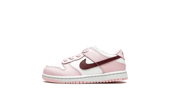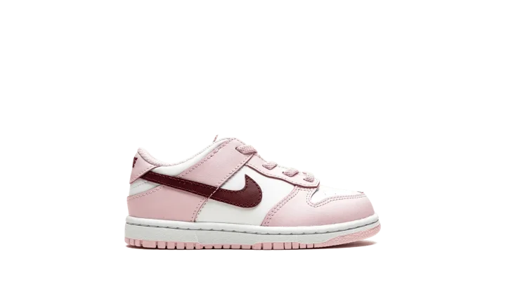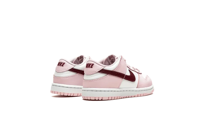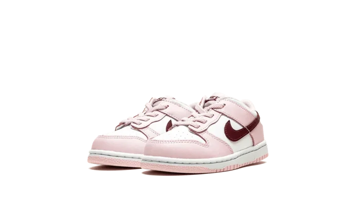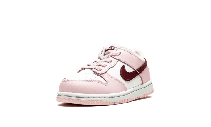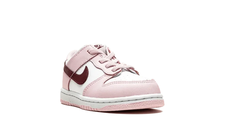 The Nike Dunk Low TD "Pink Foam" is the toddler sizing of the retro basketball shoe with eye-catching pink accents. The "Pink Foam" is complete with a white leather base contrasted with Pink Foam leather overlays. The look is broken up with a Dark Beetroot-colored leather Swoosh logo on both sides. A Dark Beetroot "Nike" logo appears on the heel and is printed on the tongue tag above a dark red Swoosh.