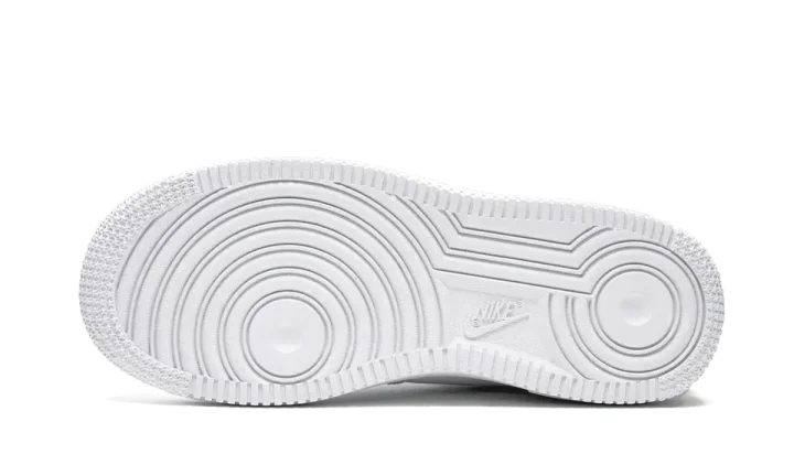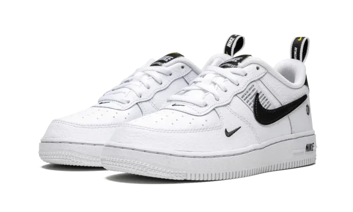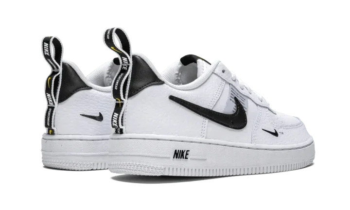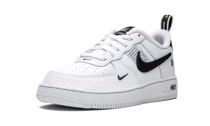 The Nike Air Force 1 LV8 adds utilitarian design to the little kids sneaker. An updated interpretation of the Air Force 1, the Nike Swoosh on the inside panel has been removed and multiple mini Swooshes — one on the lateral side, and a branded heel tab — have been added. A tag is stitched to the side that spells out the model's categorical information. This Nike Air Force 1 Utility kids shoe is made of white leather with black detailing.