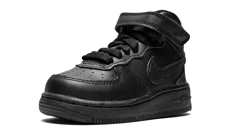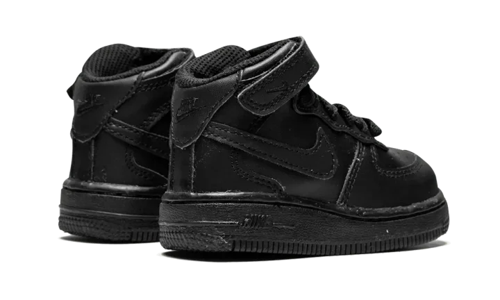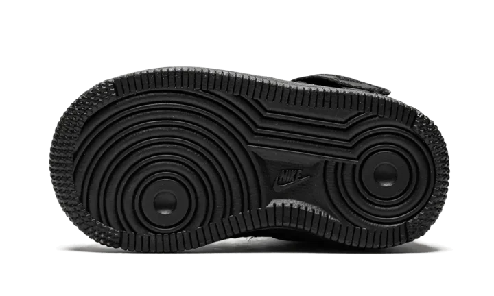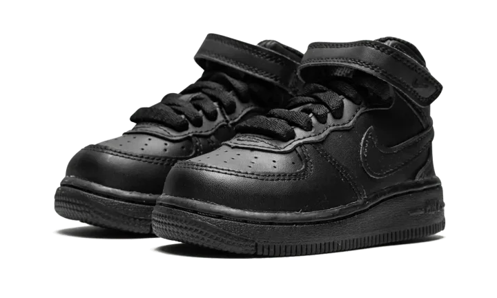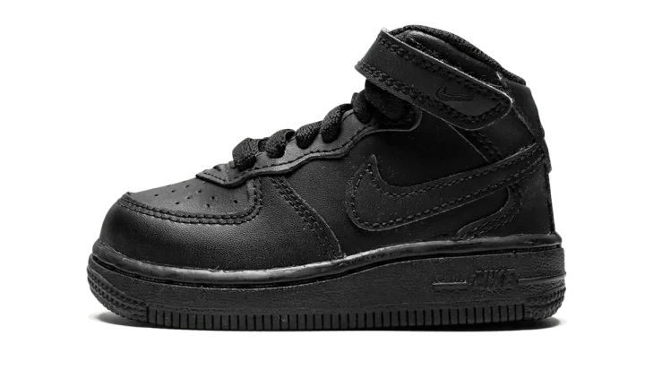 The Nike Air Force 1 Mid in tough-looking triple-black brings the fun with adult-like features on a toddler shoe. All of the classic Air Force 1 details, including the Nike Swoosh and adjustable ankle strap, are present. Resting underneath the Nike Air Force 1 Mid's upper is a durable rubber outsole, also in all-black. Signature Nike Air cushioning lends comfort and allows uninhibited play all day.