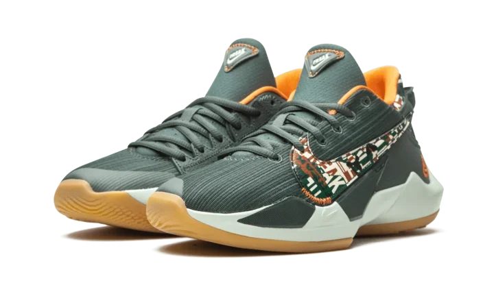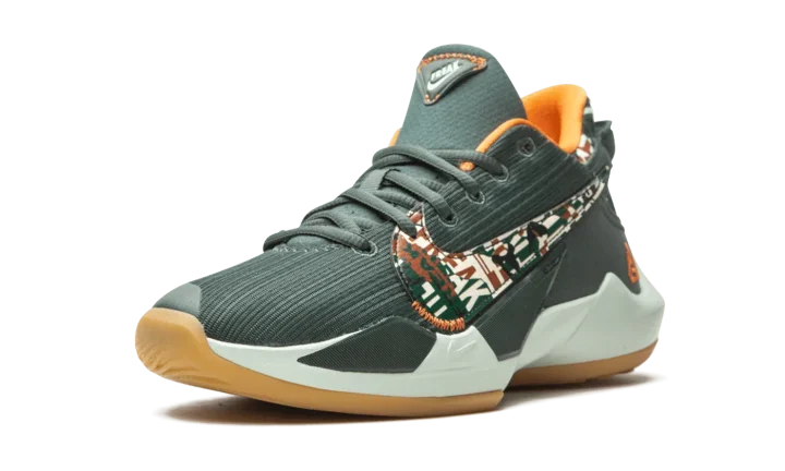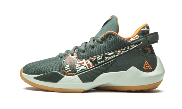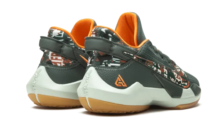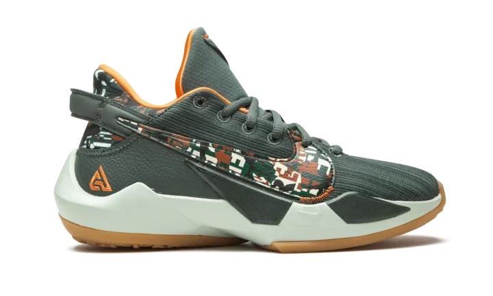 The Nike Zoom Freak 2 "Ashiko" is a kid-size version of Giannis Antetokounmpo's second signature shoe with Nike Basketball. This particular color scheme salutes the Milwaukee Bucks. A dark green woven upper is displayed with a contrasting multicolor camouflage print on the neoprene heel. The same attention-garnering pattern appears on the large Nike Swoosh found on either side of the shoe. The inner lining is cast in contrasting orange to match the embroidered "Giannis" mark on the heel. A Zoom Air unit in the forefoot of the foam midsole provides a responsive ride whether on or off the basketball court.