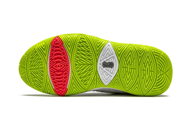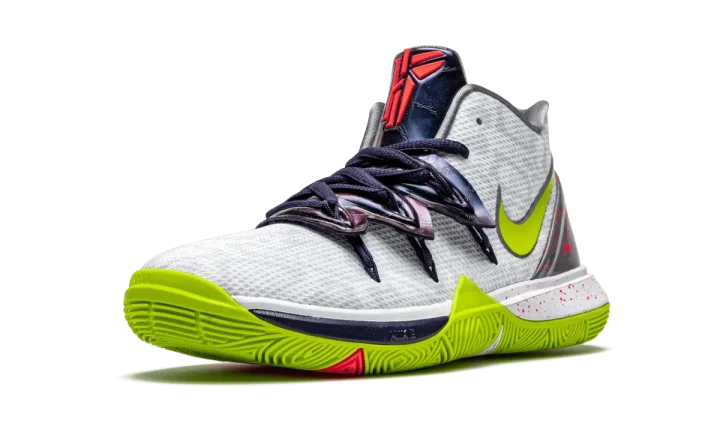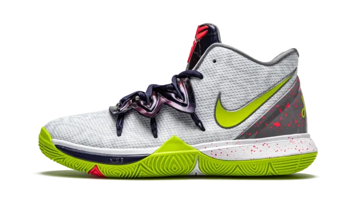 The Nike Kyrie 5 "Mamba Mentality" is a kids' shoe that pays tribute to the impact Kobe Bryant had on Kyrie Irving's career. The lightweight mesh upper in a mixture of white and grey hues features the iconic Venus flytrap-inspired overlay in metallic purple with a lime green Nike Swoosh along the side. Offering additional stability for the foot at the back of the shoe is a grey heel clip that's speckled with red. The white foam midsole offers Zoom Air cushioning with an Air Zoom Turbo system, while the volt green outsole presents ridges inspired by Irving's arm tattoos.