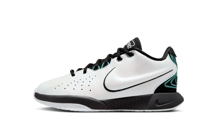The Nike LeBron 21 GS "Conchiolin" is the youth sizing of the colorway of LeBron James's twenty-first signature shoe inspired by the mollusk shell of the same name. Undoubtedly, the Nike LeBron 21 "Conchiolin" is one of the most creative colorways in the Nike Basketball collection for the 2023-2024 NBA season. The upper features a white leather construction with a pearlescent finish. Black accents appear on the tongue, collar, and lateral Swoosh, while teal-colored detailing can be found on the medial Swoosh, eyestay loops, and heel. LeBron's signature branding is seen in orange on the tongue. Release date: December 19, 2023