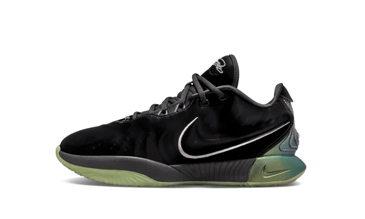 The Nike LeBron 21 GS "Tahitian" is the youth sizing of the colorway of LeBron James's twenty-first signature shoe with Nike Basketball with iridescent features. The "Tahitian" colorway features iridescent accenting on the heel and midsole that represent the glow of Tahitian pearls. The upper has a black, velvet-like synthetic construction with a shiny finish for a luxe look and feel. Underfoot, a black midsole and semi-translucent green outsole complete the look. Release date: November 3, 2023