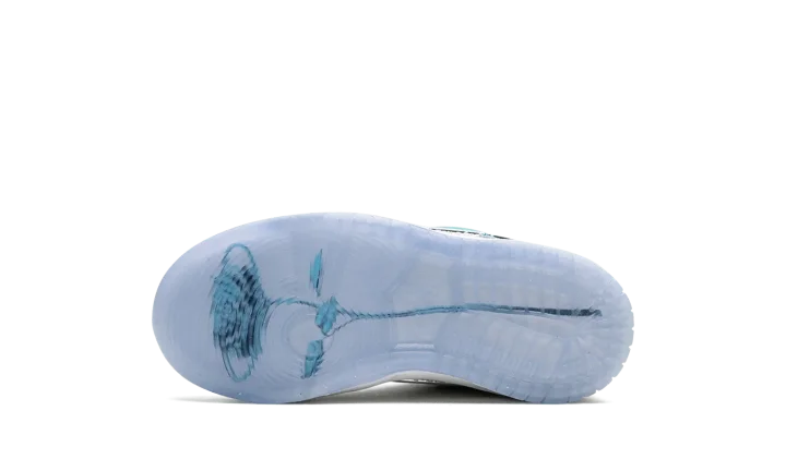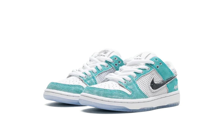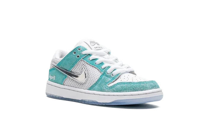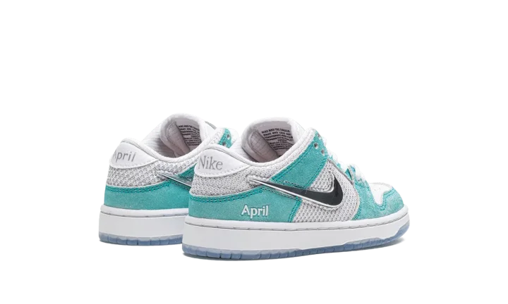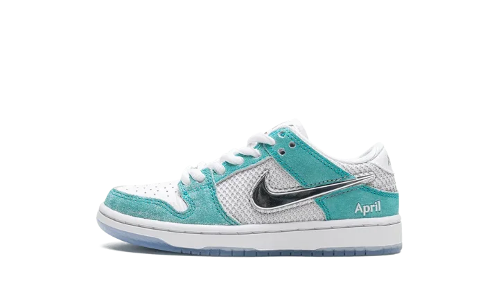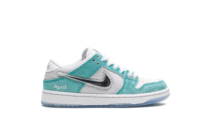 The April Skateboards x Nike SB Dunk Low PS is the preschool sizing of the shoe from the collaboration by Shane O'Neill's skateboarding brand and Nike SB. O'Neill, who is a longtime Nike SB rider, also owns his own brand called April Skateboards based out of Australia. Here, the talented pro skater and his brand team up with Nike SB to create a clean colorway of the SB Dunk Low. The upper features white mesh on the mid-panel, collar, and heel and white leather on the toe. Contrasting washed green suede overlays add an element of color to the shoe. A Metallic Silver Swoosh appears on either side and "April" branding is seen on the lateral side of the heel. Silver "April" and "Nike" branding is found on the heel of the left and right shoe, respectively. More April Skateboards detailing appears on the tongue tag. A rose motif can be found on the bottom of the icy blue translucent rubber outsole.