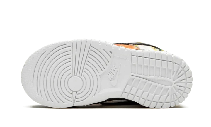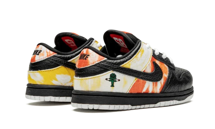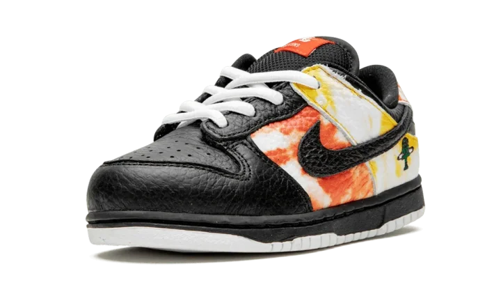 The Nike SB Dunk Low TD "Rayguns 2019" is the adorable toddler sizing of the redesigned tie-dye "Rayguns" Dunk. The "Rayguns" Dunks were initially inspired by a beloved Nike commercial series that aired during the 2002 NBA Playoffs, featuring a fictional ABA basketball team, the Roswell Rayguns. The tie-dye 2019 update pays tribute to the late Sandy Bodecker, the Nike executive responsible for the rise of Nike SB in the early 2000s. Bodecker often wore a tie-dye Rayguns hoodie, which is the inspiration for 2019's tie-dye remodel of the colorway. Like the original 2005 version, Nike SB once again decided to release the "Rayguns" Dunk in baby sizing. The brand chose the black version to recreate in toddler sizing, which features a black leather base with orange and yellow tie-dye accents and the Rayguns' alien mascot embroidered on the heel. The Nike SB Dunk Low "Rayguns 2019" for toddlers released on December 28, 2019.