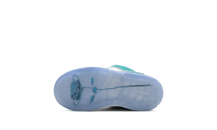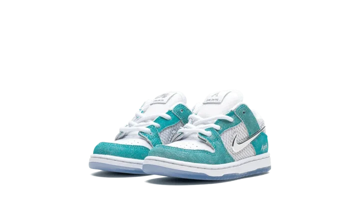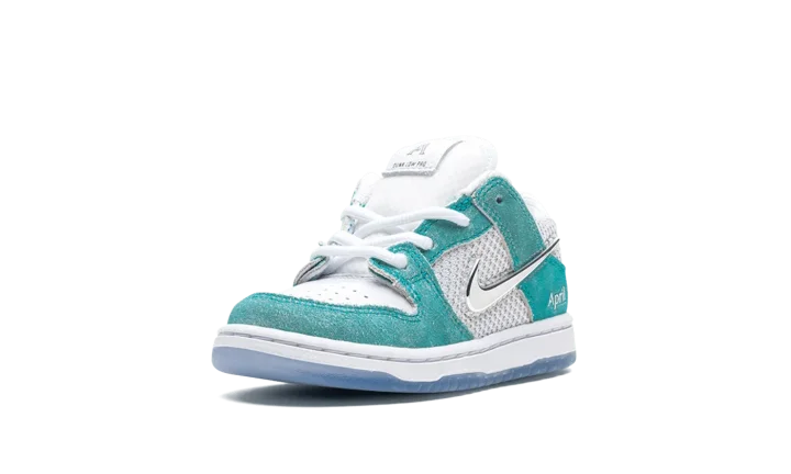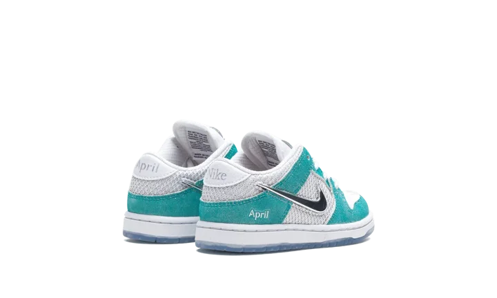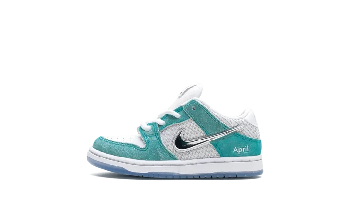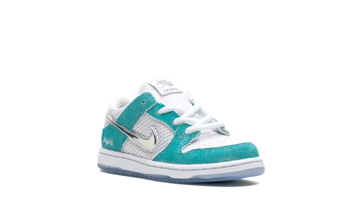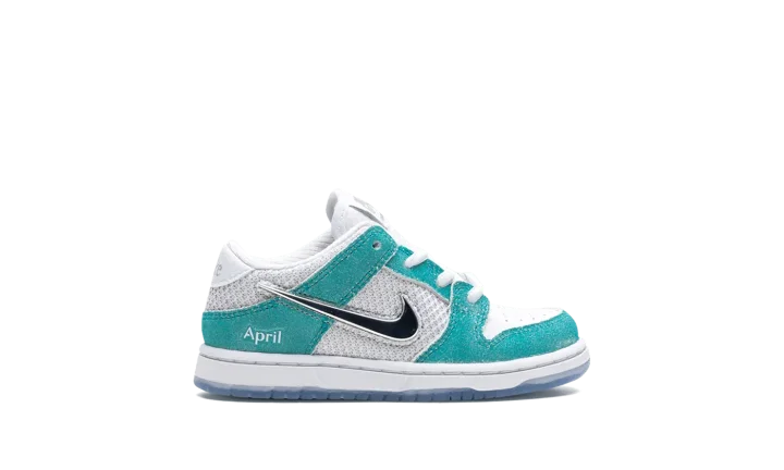 The April Skateboards x Nike SB Dunk Low TD is the toddler sizing shoe from the collaboration by Shane O'Neill's skateboarding brand and Nike SB. O'Neill, a longtime Nike SB rider, also owns his own brand called April Skateboards based out of Australia. Here, the talented pro skater and his brand team up with Nike SB to create a clean colorway of the SB Dunk Low. The upper features white mesh on the mid-panel, collar, and heel and white leather on the toe. Contrasting washed green suede overlays add an element of color to the shoe. A Metallic Silver Swoosh appears on either side and "April" branding is seen on the lateral side of the heel. Silver "April" and "Nike" branding is found on the heel of the left and right shoe, respectively. More April Skateboards detailing appears on the tongue tag. A rose motif can be found on the bottom of the icy blue translucent rubber outsole.