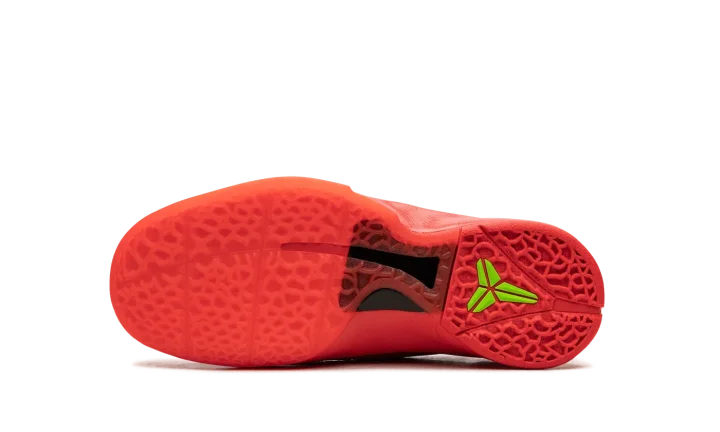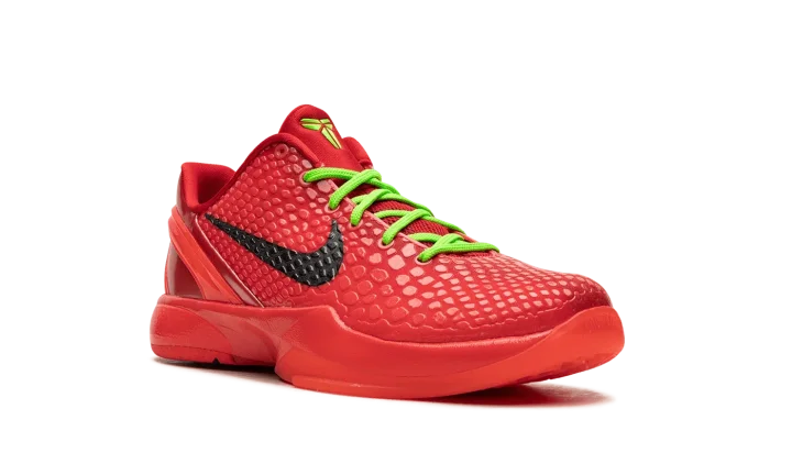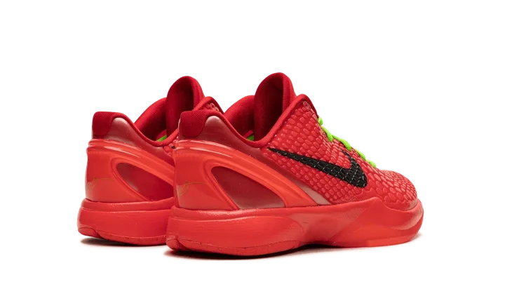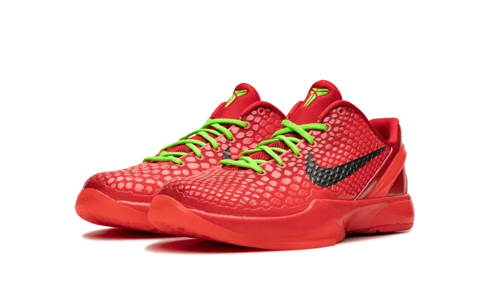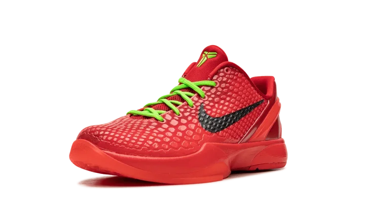 The Nike Zoom Kobe 6 Protro GS "Reverse Grinch" is the youth sizing of the alternate version of the popular, Christmas-inspired colorway of Kobe Bryant's sixth signature shoe. Inspired by the mostly all-green Kobe 6 "Grinch" colorway, the "Reverse Grinch" flips the original design's color block to feature a red upper with green laces. The shoe is complete with a Bright Crimson snakeskin-textured upper with black Swooshes on the sides. Both the laces and Kobe's "Sheath" logo are designed in Electric Green. A Bright Crimson rubber sole completes the look. Release date: December 16, 2023