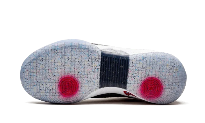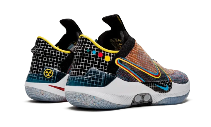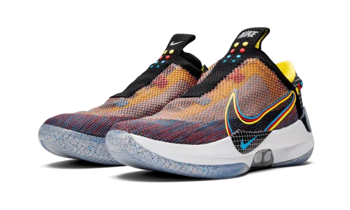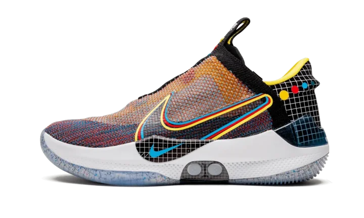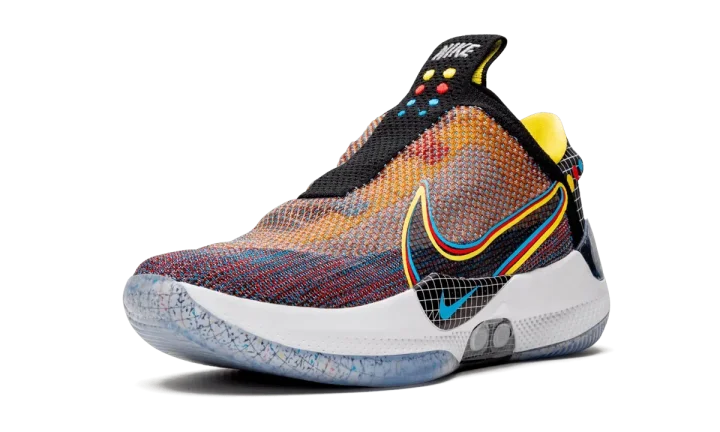 The Nike Adapt BB "Multicolor" is a high performance basketball shoe crafted with Nike's innovative Adapt technology for the ultimate customized fit. Nike's first self lacing sneaker built for the hardwood, the Adapt BB is replete with a motorized component within the midsole that powers the self lacing technology via the Nike Adapt app. The multicolor woven upper calls back to the design found of some of Nike's most desirable performance runners and lifestyle models. An oversized Swoosh with yellow, red, and blue outlining overlaps the mid-panel and midsole. A mini light blue Swoosh graces the white midsole. An embroidered Swoosh and Nike detailing can be found on the tongues of the left and right shoe, respectively. A black and white grid pattern dots the molded heel. The Nike Adapt BB "Multicolor" was released on October 4, 2019.