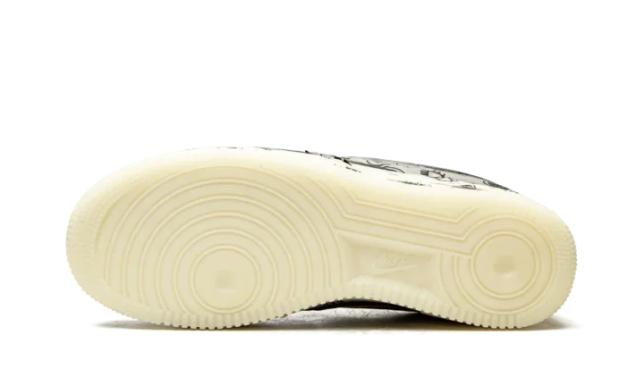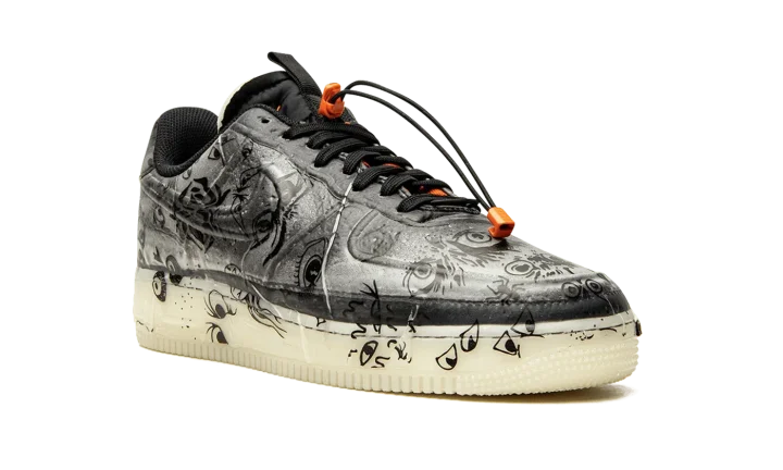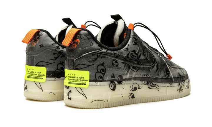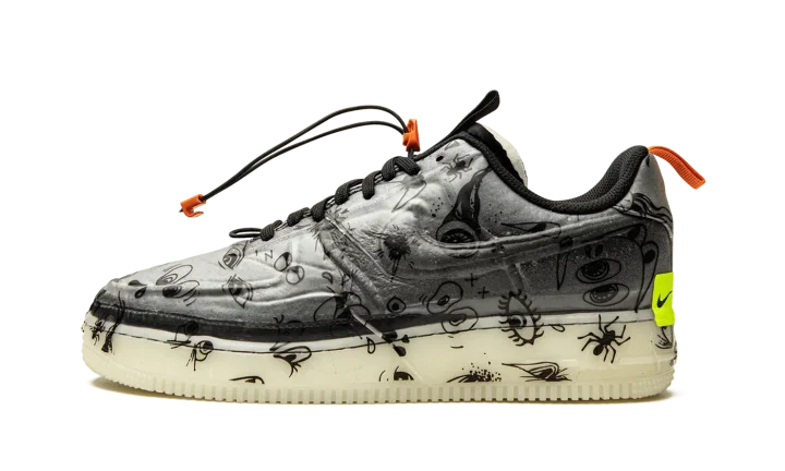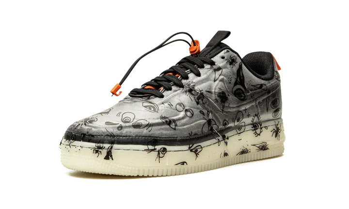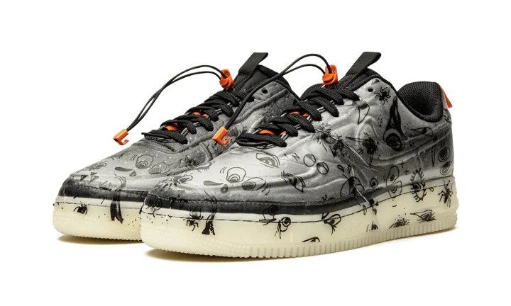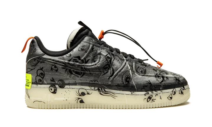 The Nike Air Force 1 Experimental "Halloween" is a frightfully-good colorway of the alternate, future-forward version of the classic low-top shoe by Nike. Released in October 2021 and part of Nike's Halloween footwear collection, the aptly named "Halloween" version of the Air Force 1 Experimental features a greyscale vacuum sealed look that is constructed with an all-over "seeing eye" pattern. A bright neon green, industrial-style "Guarantee of Quality" label appears on the heel. Inverted "Nike Air Force 1" branding is embroidered in orange on the heel tab beneath the orange nylon pull tab. Drawstring laces give the shoe a decidedly modern look. The aforementioned "seeing eye" design appears on the glow-in-the-dark midsole. Release date: October 21, 2021