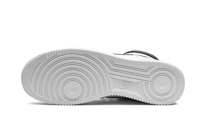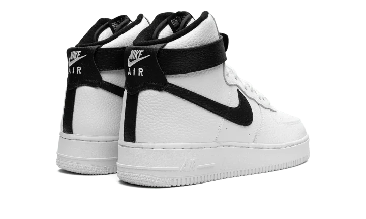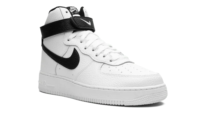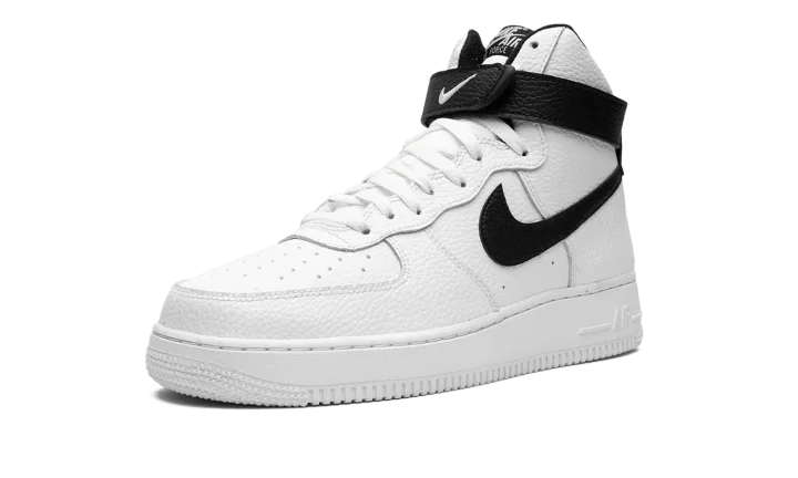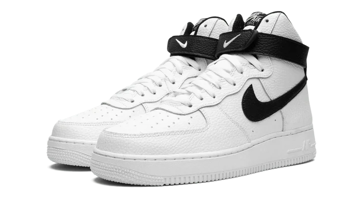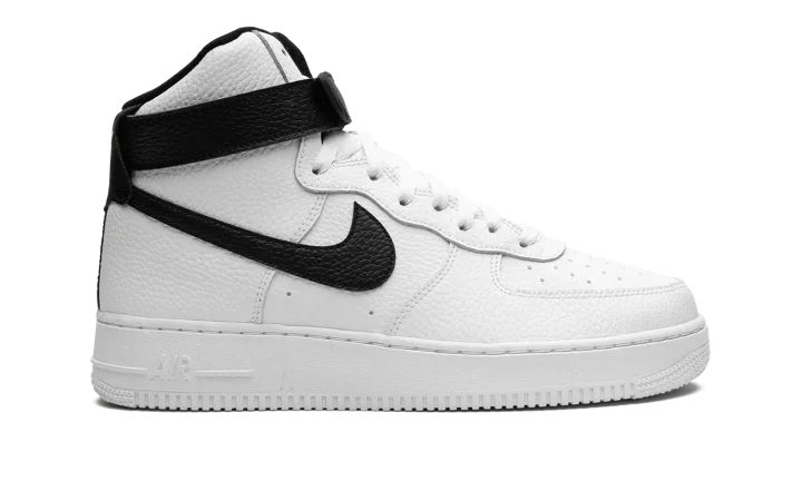 White/black leather Air Force 1 High '07 sneakers from NIKE featuring signature Swoosh logo detail, embroidered logo to the rear, round toe, front lace-up fastening, logo patch at the tongue, front touch-strap fastening, ankle-length, branded insole and rubber sole. These styles are supplied by a premium sneaker marketplace. Stocking only the most sought-after footwear, they source and curate some of the most hard to find sneakers from around the world..