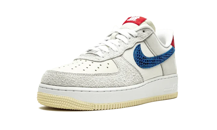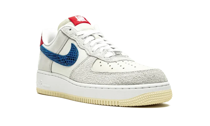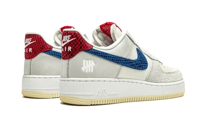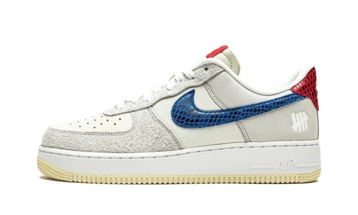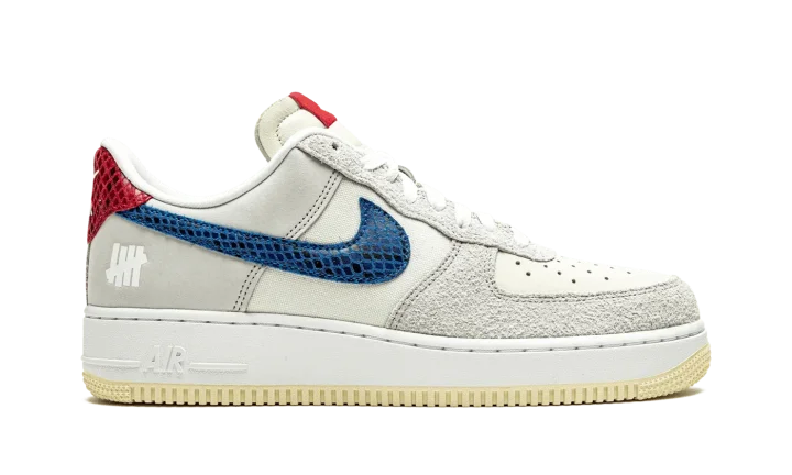 The Undefeated x Nike Air Force 1 Low "5 On It" is a collaboration between the California based sneaker boutique and Nike on the vintage basketball shoe that displays five unique materials on its design. An August 2021 release by the longtime collaborators, the "5 On It" has a blue snakeskin Swoosh and a red snakeskin heel tab. The eyelet panels appear in grey suede, the mid-panel comes in Sail canvas, and the perforated toe is cast in cream leather. Undefeated's "5 Strikes" logo can be found on the orange nylon tongue tag. Finishing touches include a white rubber midsole with "Air" on the heel paired with a contrasting cream-colored outsole. Release date: August 20, 2021