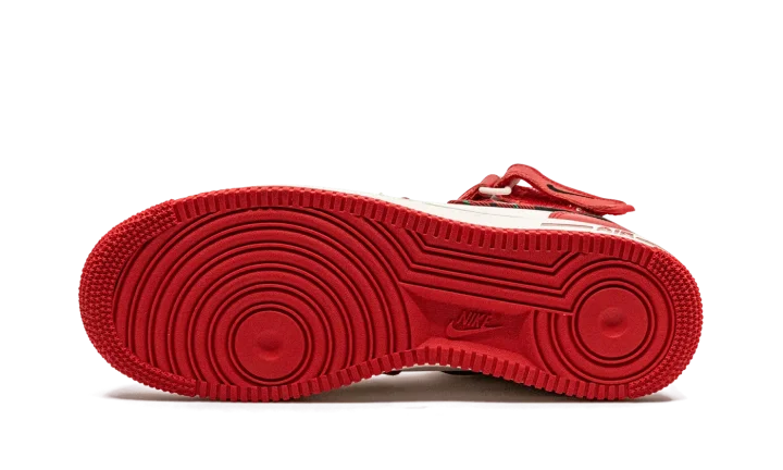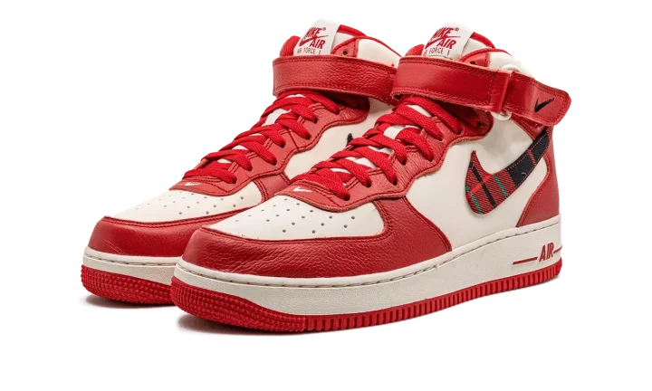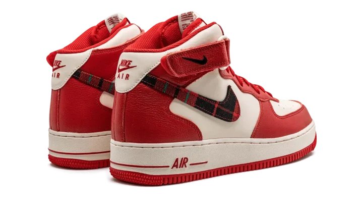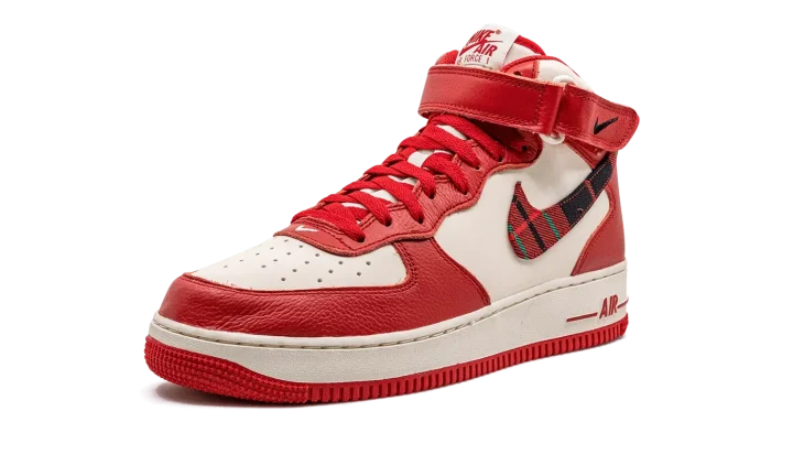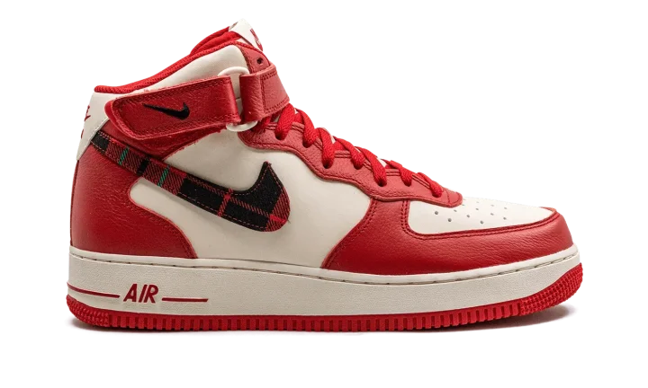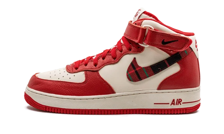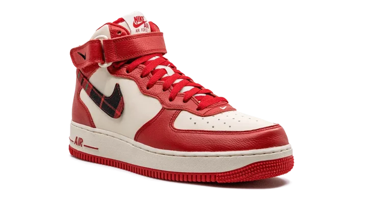 The Nike Air Force 1 Mid LX "Red Plaid" is a casual, lifestyle-inspired colorway of the retro basketball shoe with an eye-catching red tartan Swoosh. The "Red Plaid" Air Force 1 Mid features a vintage look with a Pale Ivory leather base contrasted with University Red leather overlay panels. A red plaid Swoosh appears on the sides. Other branding includes a black Swoosh on the side of the adjustable collar strap and a black "Nike Air" hit on the heel.