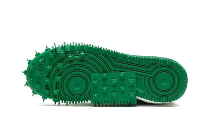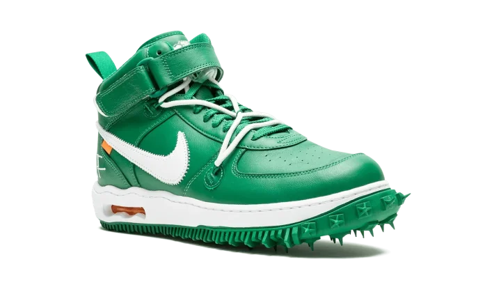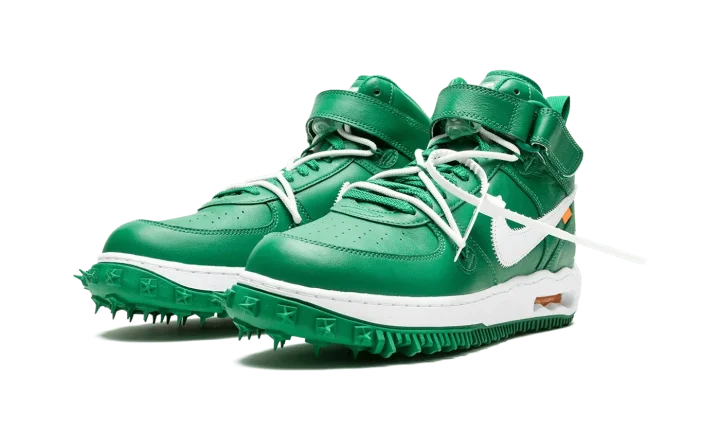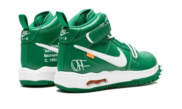 The Off-White x Nike Air Force 1 Mid "Pine Green" is yet another popular and creative collaboration by the late, great sneaker and fashion designer. The Air Force 1 Mid by Virgil Abloh for Off-White succeeds the brand's previous Air Force 1 Low collaborations that were released from 2017 through 2022. The "Pine Green" is one of several colorways of the AF1 Mid by Off-White, and it features a Pine Green leather construction with tonal leather overlays. A white leather Swoosh appears on either side of the shoe. Off-White's signature dual lacing system gives the design a futuristic look, as does Off-White's industrial-inspired branding on the medial side of the mid-panel. "Off" branding is found on the lateral side of the right shoe and a candelabra is found on the lateral side of the left shoe. The outsole features multiple green spikes. Release date: April 28, 2023