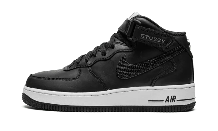 The Stussy x Nike Air Force 1 Mid "Black" is one of several colorways of the mid-top retro basketball shoe co-designed by the California based streetwear brand in May 2022. The Air Force 1 Mid "Black" is a popular release by Stussy and Nike that follows the brand's collaboration on the Air Force 1 from 2020. The design features a black leather base with black leather overlays. The Swoosh logo on the sides is designed in black leather with a reptilian pattern. Classic "Stussy" branding is embroidered on the side of the adjustable black leather ankle strap. Stussy's interlocking "SS" detailing is found on the heel. Additionally, Stussy's "worldwide" branding, including a list of the cities the brand has retail locations in, is printed on the tongue tag. Dotted "SS" detailing is found on the toe. Release date: May 13, 2022