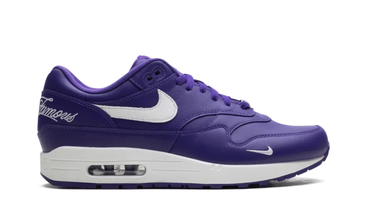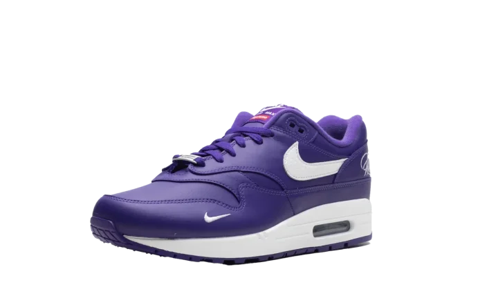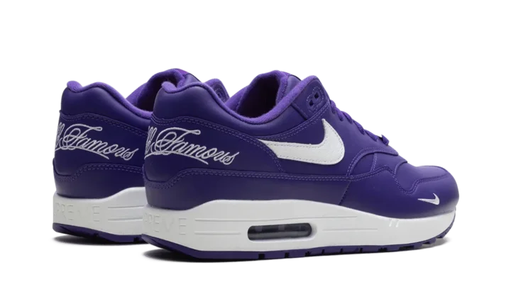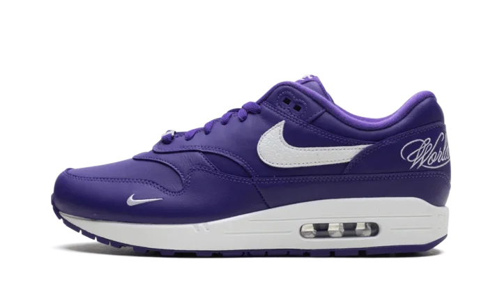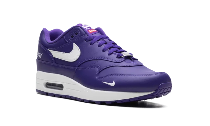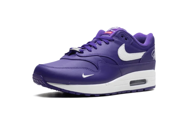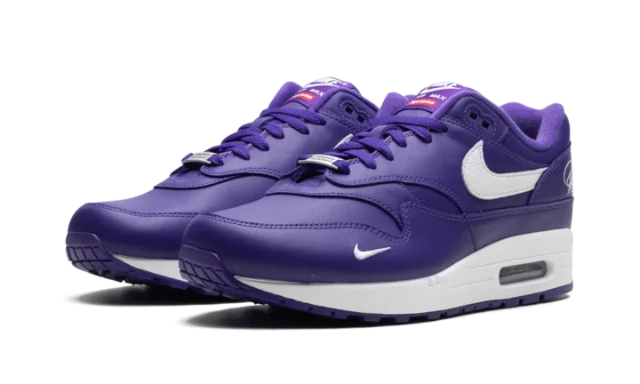 The Supreme x Nike Air Max 1 '87 SP takes Tinker Hatfield's 1987 masterpiece and gives it a vibrant, updated look with exclusive detailing from the renowned streetwear giant. The 'Varsity Purple' colorway delivers a striking, classic athletic feel with its high-contrast color blocking.