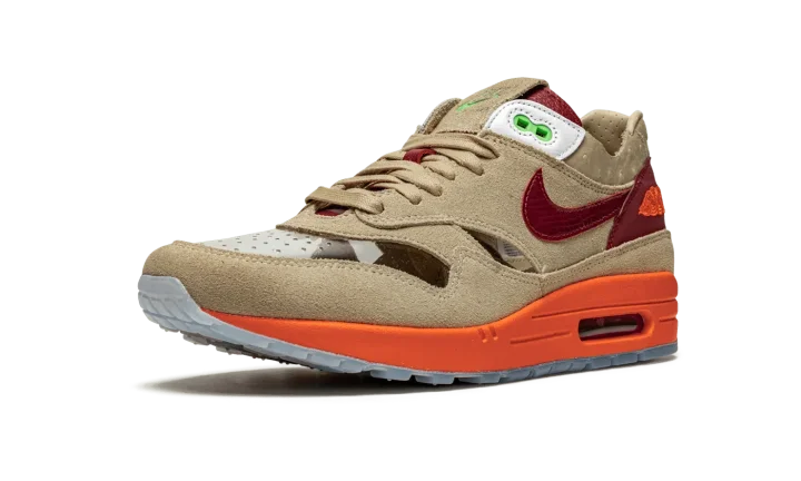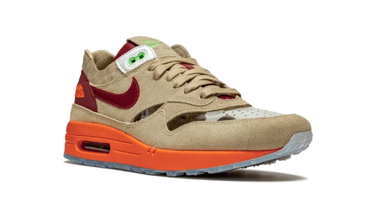 Net/deep red/orange blaze leather/rubber Air Max 1 sneakers from NIKE featuring round toe, flat rubber sole, front lace-up fastening, branded insole, signature Swoosh logo detail and perforated toebox. These styles are supplied by a premium sneaker marketplace. Stocking only the most sought-after footwear, they source and curate some of the most hard to find sneakers from around the world..