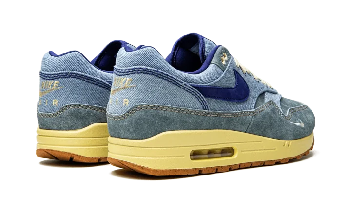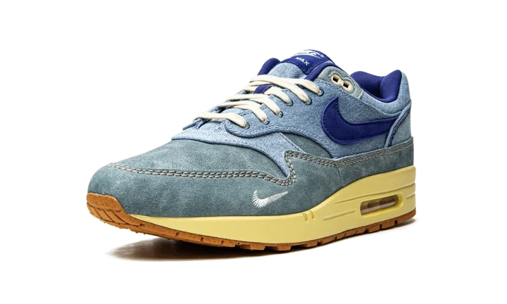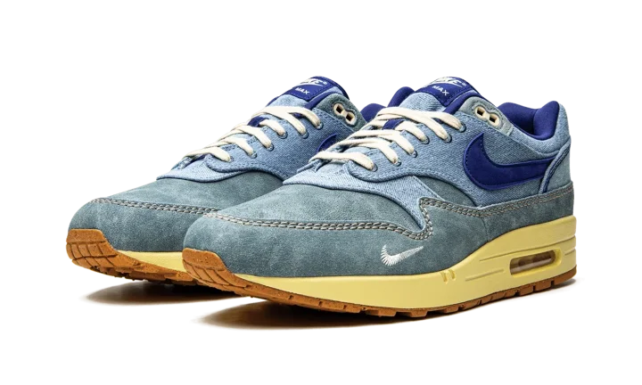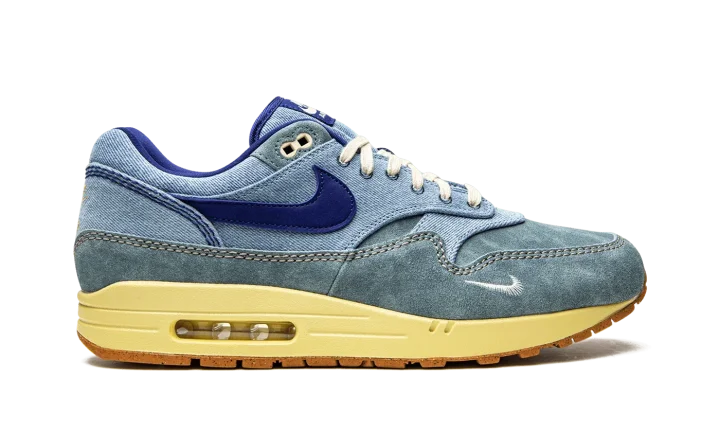 The Nike Air Max 1 "Dirty Denim" is a unique colorway of the retro running shoe that looks to none other than well-worn jeans for design inspiration. A Summer 2022 release, the "Dirty Denim" is a modern reissue of sorts of the same colorway that Nike introduced back in 2003. Here, the upper features a combination of a washed indigo denim base with vintage-inspired blue suede overlays. Deep Royal Blue leather appears on the Swoosh on either side of the shoe. The same dark blue hue also appears on the tongue tag with "Nike Air Max" and Swoosh" branding and inner lining. A contrasting Lemon Wash-colored midsole furthers the shoe's throwback appearance. Release date: August 26, 2022