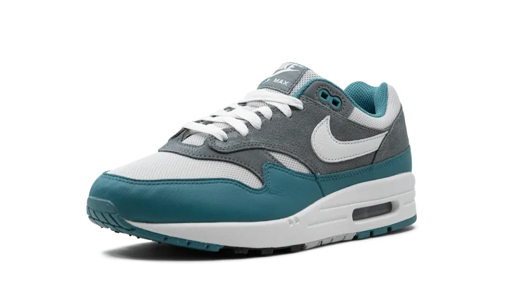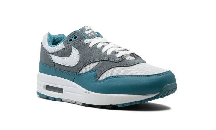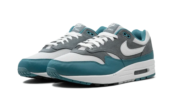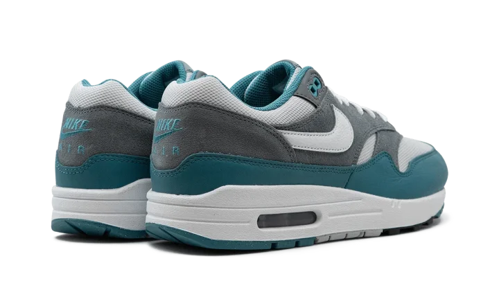 The Nike Air Max 1 "Noise Aqua" is a colorway of the retro performance running shoe with aqua-colored details. Designed by iconic Nike footwear designer Tinker Hatfield and originally released in 1987, the Air Max 1 is one of the most essential shoes in Nike's storied history. The "Noise Aqua" colorway features a white mesh upper contrasted with a grey suede overlay on the midfoot and heel. A Noise Aqua-colored leather mudguard adds a pop of color to the design. White leather Swoosh branding appears on each side of the shoe, while classic "Nike" detailing can be found on the heel and tongue tag. A visible Air unit appears in the heel of the white foam midsole, completing the impressive look. Release date: October 29, 2023