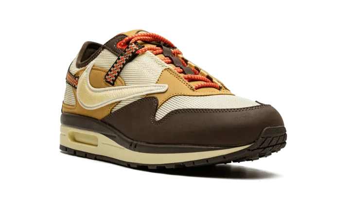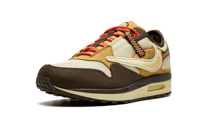 The Travis Scott x Nike Air Max 1 "Baroque Brown" is a limited edition collaboration between the hip-hop superstar and Nike that modifies the iconic retro running shoe with rugged, outdoors-inspired details. One of two colorways of the Air Max 1 co-designed by Travis Scott and Nike in December 2021, the "Baroque Brown" does away with the tonal look that defines the "Saturn Gold" edition of Scott's Air Max 1, and instead favors multiple earth tones. The upper features a Lemon Drop-colored mesh construction with Baroque Brown leather overlays on the mudguard, toe and the heel. Scott's signature inverted Swoosh is embroidered on the lateral side while the Swoosh on the medial side faces the correct, original direction. Pocket knife-inspired straps with geometric detailing appear on the collar and heel. The red rope laces found on the tongue feature speckle detailing. Dual "Nike" and "Cactus Jack" branding on the left and right shoe, respectively. "Cactus Corporation" branding appears on the outsole. Release date: December 16, 2021