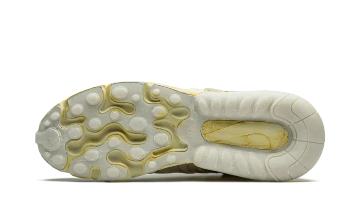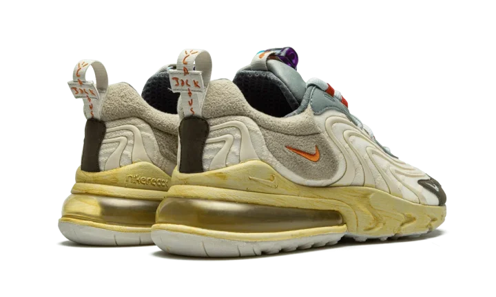 The Travis Scott x Nike Air Max 270 React "Cactus Trails" is another of the chart topping rapper's coveted releases with Nike. Having previously applied his formula of off-kilter Texas rodeo-meets-hip-hop aesthetics to the Air Force 1, Air Jordan 4, and other models in the past, Scott sets his sights on Nike's ultra comfortable lifestyle shoe for Summer 2020. The upper features wavy cream synthetic overlays sitting atop the tonal mesh base. A brown nubuck toe cap with mini embroidered Swoosh branding adds contrast. Fuzzy light grey felt details the collar and mid-panel. Additional detailing includes Dark Haze eyelets, an embroidered orange Swoosh on the mid-panel, and a pre-yellowed React midsole for a decidedly vintage vibe. Nike's large Air cushioning unit in the heel provides plenty of comfort for long walks on the trail... not that you'd actually wear this coveted shoe for any sort of hiking activity. Release date: May 29, 2020.