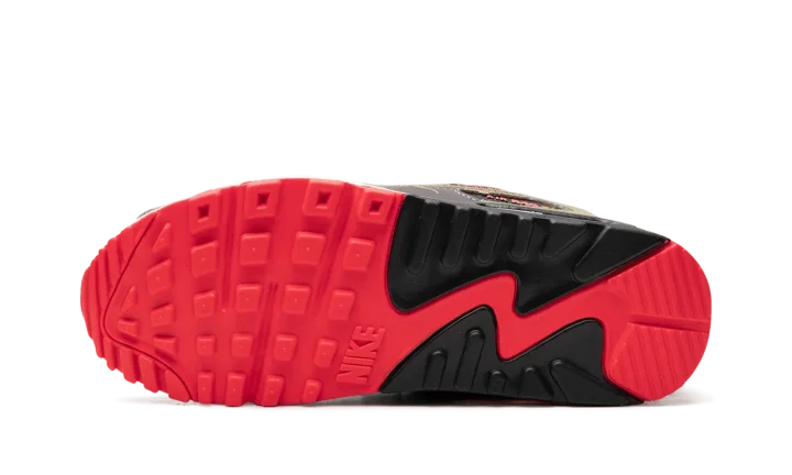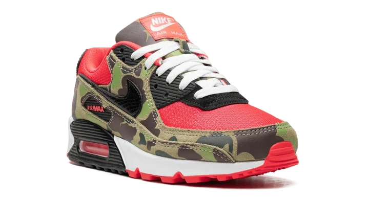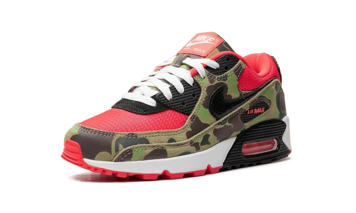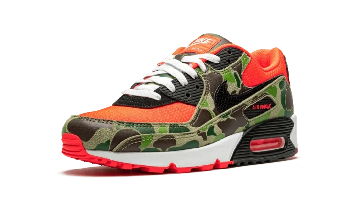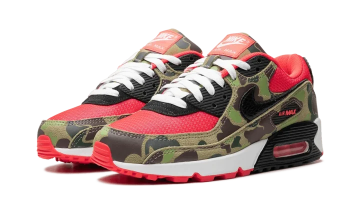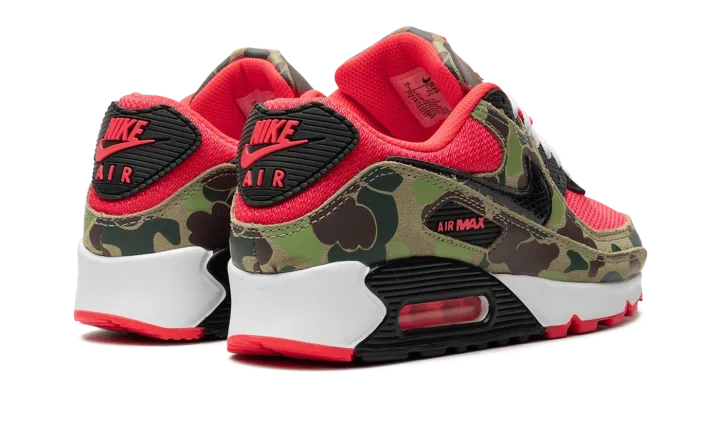 The Nike Air Max 90 "Reverse Duck Camo" honors an iconic, extremely sought-after colorway of the early '90s silhouette for Air Max Day 2020. The "Reverse Duck Camo" draws heavily from the atmos x Nike Air Max 90 "Duck Camo" that was released in 2013, only reversing the color scheme of the original motif. Hardly subtle in its appearance, the upper features a fiery Infrared mesh toe, collar, and heel. A duck camouflage pattern dots the mid-panel, toe cap, and mudguard. A black leather Swoosh and black Air Max branding window on the mudguard are true-to-original design elements of the Air Max 90. Additional Nike branding is found on the heel and tongue tab. Release date: March 26, 2020.