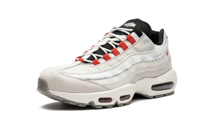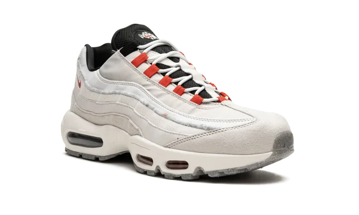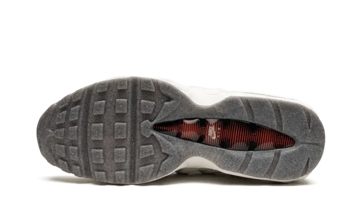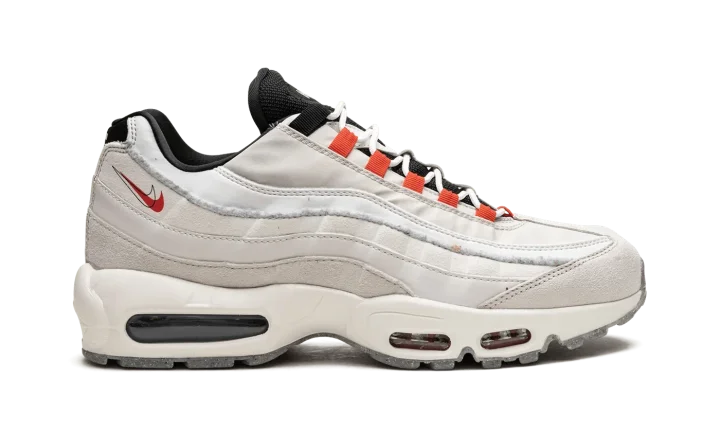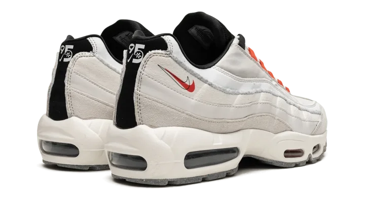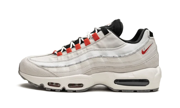 The Nike Air Max 95 SE "Double Swoosh" is a colorway of the vintage performance running shoe with layered Swooshes on its collar. The Air Max 95's legacy continues on the "Double Swoosh" colorway, a unique release from Nike's Spring 2023 line. Design wise, the shoe features white and light grey textile panels that resemble the sternum of an anatomical ribcage. Stacked black outline and red Swooshes appear on the collar. A "95" logo can be found on the heel and an updated "Air Max 95" graphic is found on the tongue. The white foam midsole features red-tinted Air bubbles in the forefoot and a smoky Air bubble in the heel. Release date: August 11, 2022