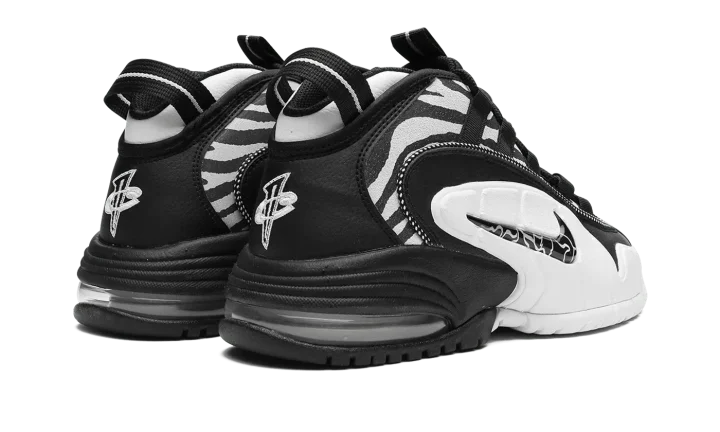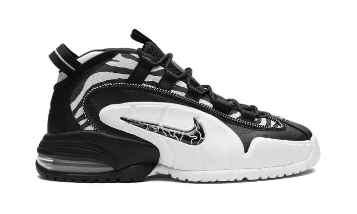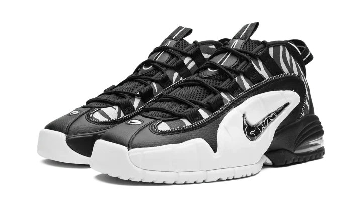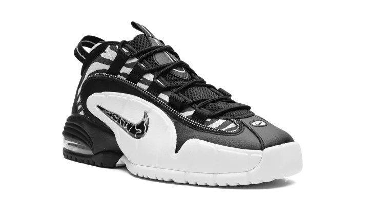 The Nike Air Max Penny 1 "Tiger Stripes" is a colorway of Anfernee "Penny" Hardaway's first signature shoe with decidedly lifestyle-ready details. The Air Max Penny 1 was reintroduced in its original "Orlando" and "Home" colorways for the first time in many years in 2022, and issued in new and exciting colorways like the "Tiger Stripes" thereafter. The shoe features a black leather upper with contrasting black-and-white tiger stripes on its eyelets and collar. A white Jeweled Swoosh with white contrast detailing appears on either side of the white rubber panel on the midfoot. A visible Air cushioning unit is found on the heel of the black midsole. Release date: February 2, 2023