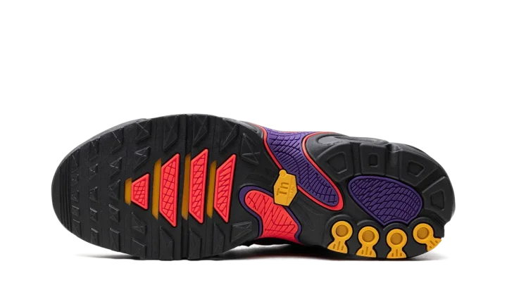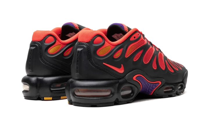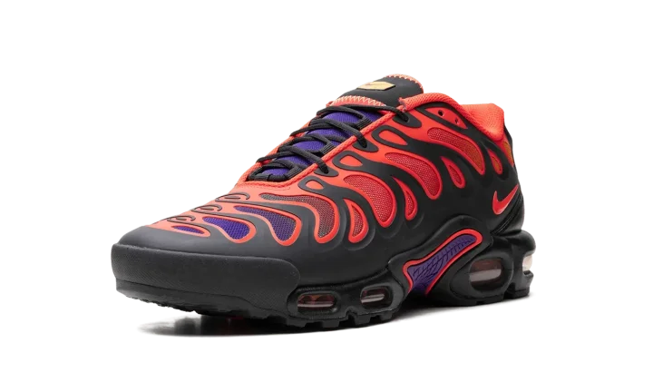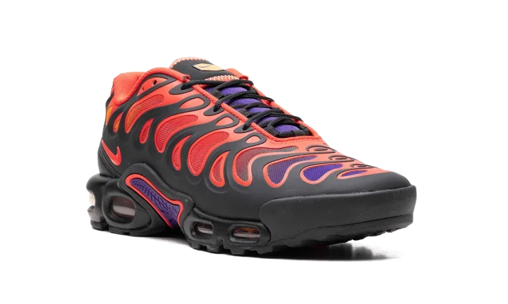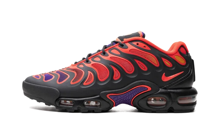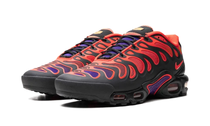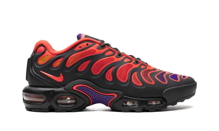 The Nike Air Max Plus Drift "All Day" is a can't-miss colorway of the shoe based on the classic Nike Air Max Plus model. The Air Max Plus Drift was introduced in 2024 and is an evolution of the Air Max Plus, as the former shoe has the same wavy overlay panels as its predecessor, but with a substantially more bold look. A combination of Field Purple, Laser Orange, and Bright Crimson hues appear on the design in a gradient pattern. The Swoosh logo extends from the midfoot to the heel, a distinguishing feature. Underfoot, the sole unit is mostly identical to the Air Max Plus's original Tuned Air tooling