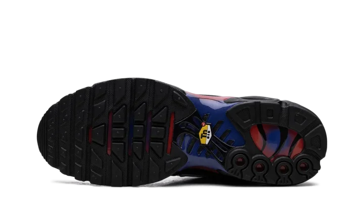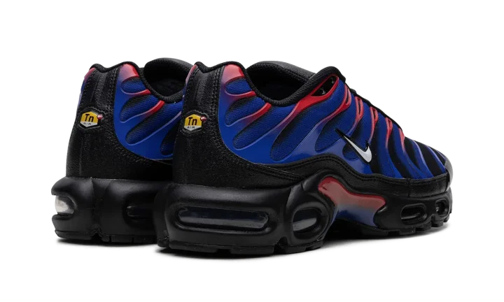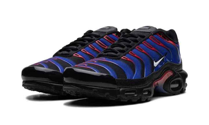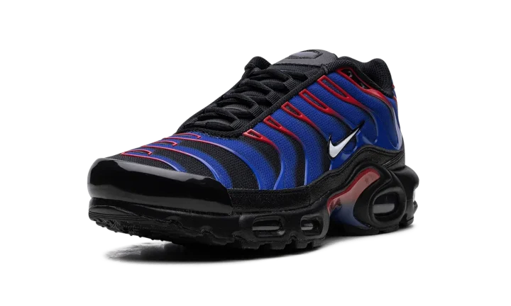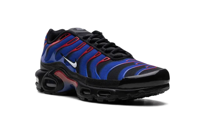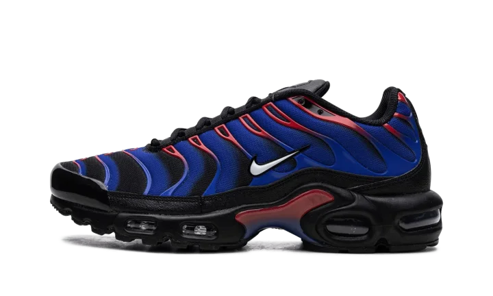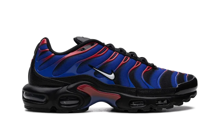 The Nike Air Max Plus "Spider-Man" is a colorway of the retro performance running shoe in a color scheme that draws comparisons to Spider-Man. While not associated with the "Spider-Man" film franchise, the "Spider-Man" colorway features the colors associated with "Spider-Man's" outfit. More specifically, the shoe has a black mesh construction with University Red and Racer Blue wavy TPU overlays. A white jeweled Swoosh is seen on the sides. The midfoot shank is designed in swirls of blue and red to complete the sneaker's "Spider-Man" inspired look. Release date: August 1, 2023