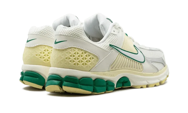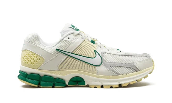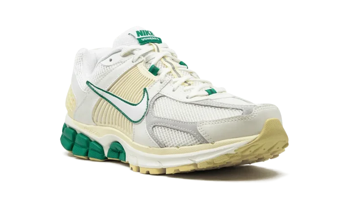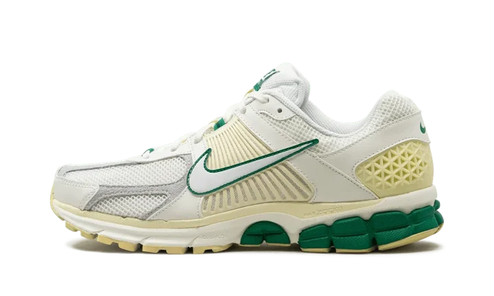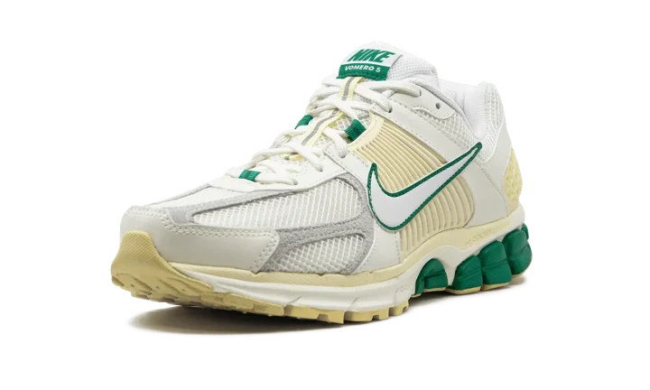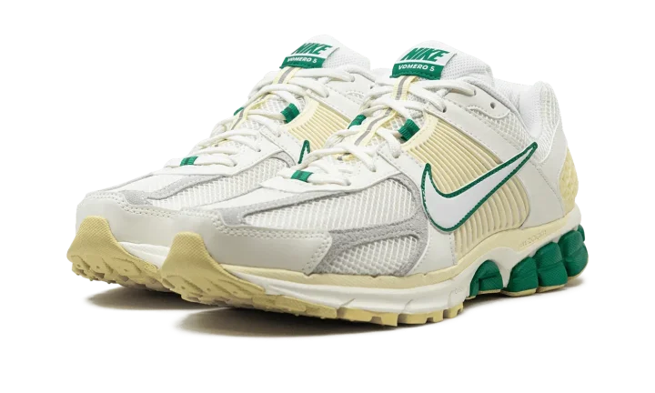 The Nike Zoom Vomero 5 "Back 9 - Masters" is a colorway of the retro shoe from Nike's Masters-inspired collection. Inspired by the green-and-yellow Masters Tournament logo, the Zoom Vomero 5 "Back 9 - Masters" features a Sail, White, Malachite, and Alabaster color combination across its mesh, leather, and suede construction. A white Swoosh outlined in green appears on both sides of the shoe. Sail-colored synthetic overlays can be found on the sides and on the heel counter. "Vomero 5" branding appears on the tongue. A white and green midsole completes the look. Release date: May 14, 2024