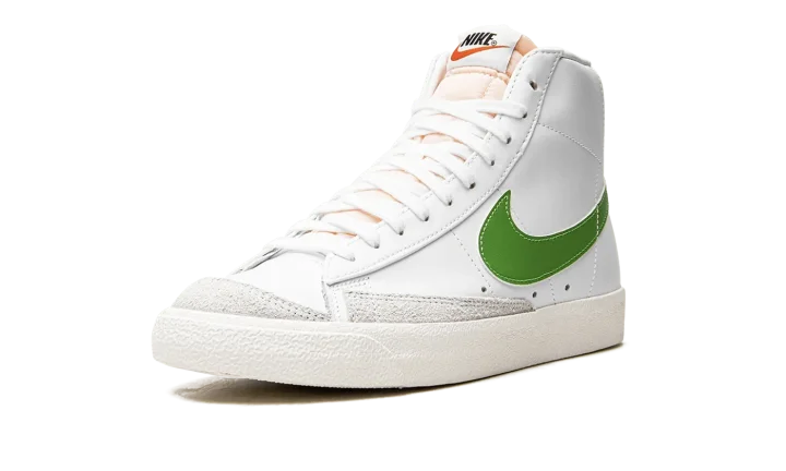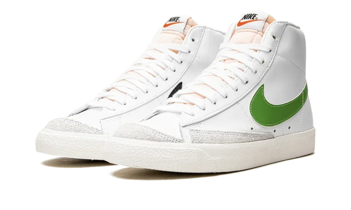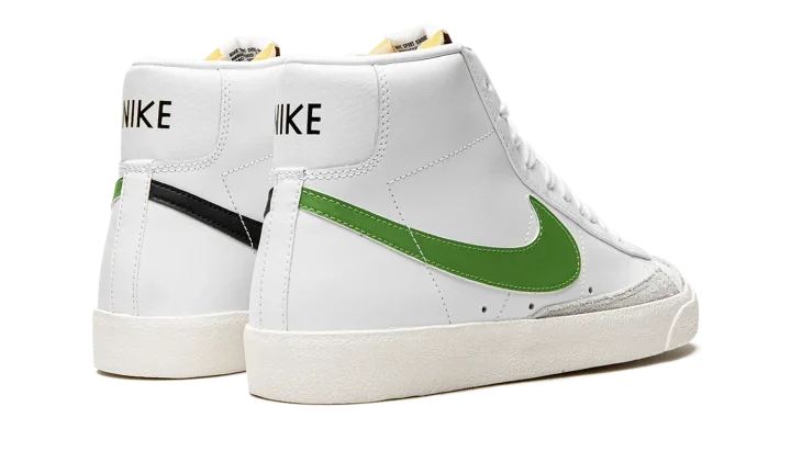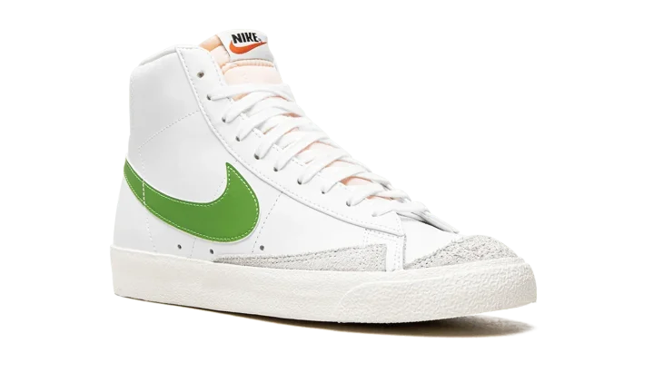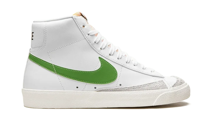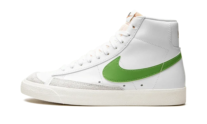 The Nike Blazer Mid '77 "Chlorophyll" brings a pop of green to the classic basketball sneaker. The leather upper keeps the classic look of the original Blazer with an all-white treatment accented with Chlorophyll green Swooshes. Autoclave construction for the sole unit fuses the outsole to the midsole for a streamlined look that echoes the '70s design.