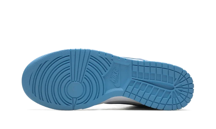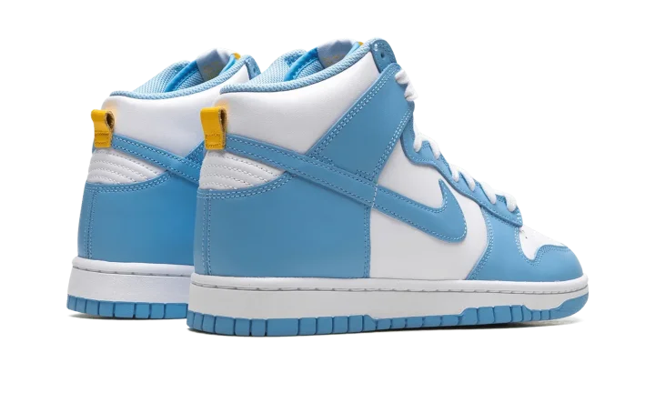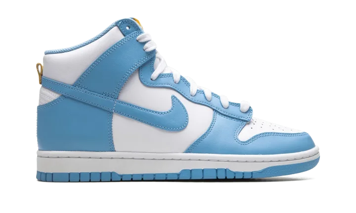 The Nike Dunk High "Blue Chill" is a mostly two-tone, white-and-blue colorway of the classic sneaker. White leather is found on the perforated toe, mid-panel, collar, and heel. Blue Chill-colored leather overlays and Swoosh branding contrast the neutral-colored base. The Nike logo on the white nylon tongue tag appears in yellow, as does the pull tab on the heel. A white midsole and Blue Chill rubber outsole complete the look. Release date: August 20, 2022
