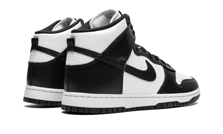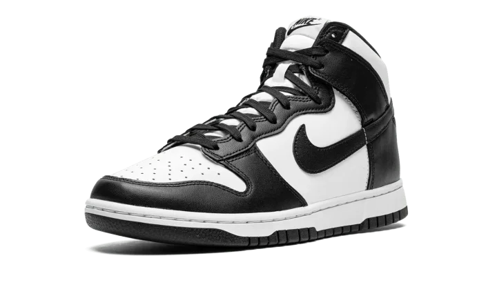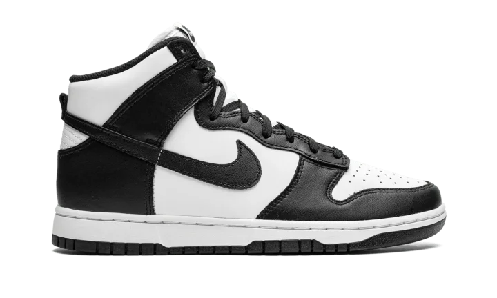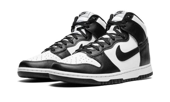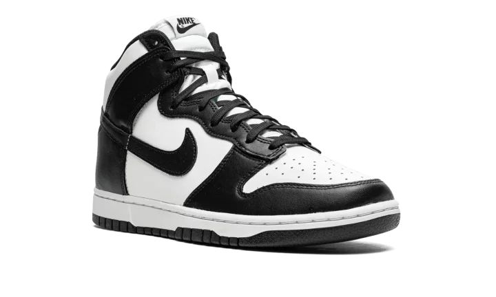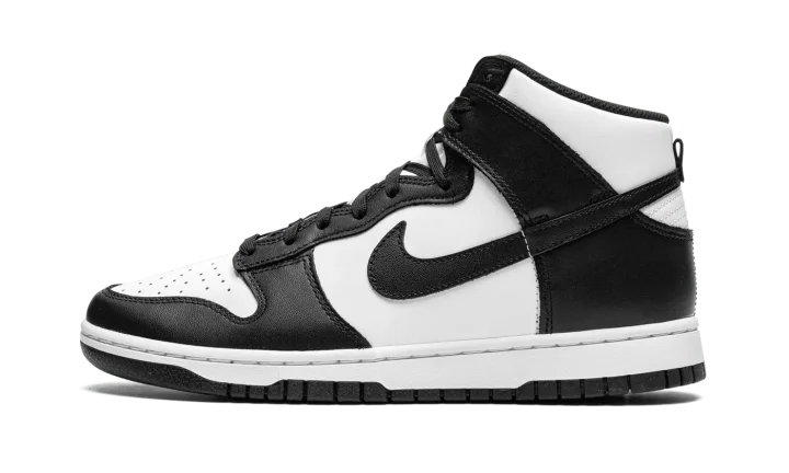 The Nike Dunk High "Black/White" or "Panda" is a two-tone, white-and-black colorway of the vintage basketball shoe that was released in January 2022. An all-time classic style, the black-and-white Dunk features white leather on the perforated toe, mid-panel, collar, and heel. The neutral-colored base is contrasted with black leather overlays and Swoosh branding. The shoe's two-tone, appearance continues with a black interior lining, a white nylon tongue, and white nylon tongue tag with black "Nike" and Swoosh branding. Black laces, and a white midsole and black outsole finish off the look. Release date: January 27, 2022